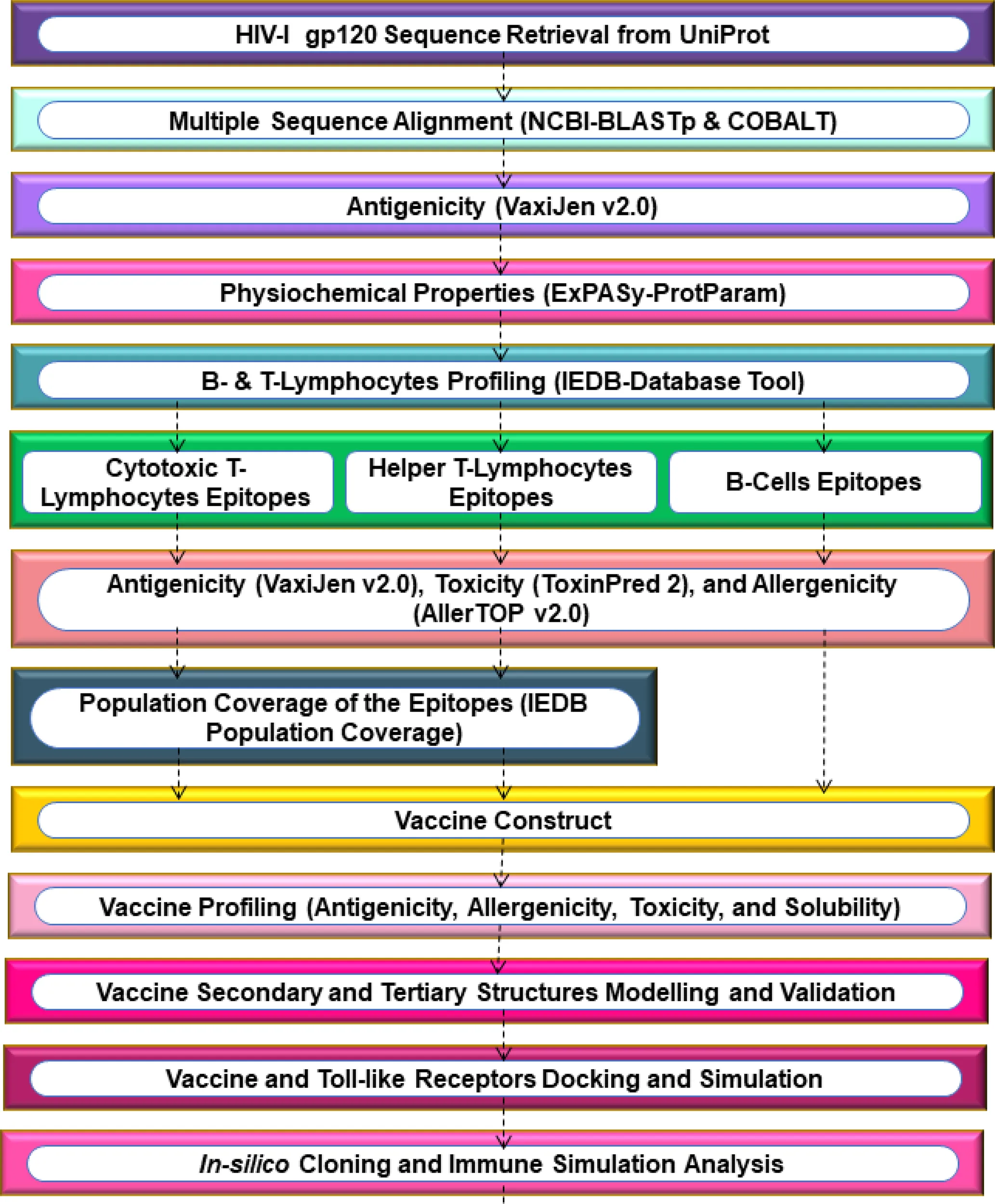 The HIV-1 gp120 sequence was retrieved from the UniProt database (UniProt ID: Q9IZE4), as reported in a clinical trial (62). This sequence represents a well-characterized HIV-1 strain with structural and functional relevance to vaccine studies (63). The gp120 sequence was searched on BLASTp to obtain a highly similar sequence. The ≥80% of identical gp120 sequences were aligned using COBALT (Constraint-based Multiple Alignment Tool) to identify conserved regions in the HIV-1 gp120 sequence. This process leveraged both local sequence similarity and conserved domain information.