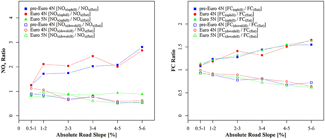 Figure 10. NOx (left) and FC (right) ratios of uphill (slope >0.5%) and downhill (slope < −0.5%) road slope over flat road (∣slope∣ < 0.5%) as a function of absolute road slope classes for the various investigated technologies (distance-integration: 500 m).