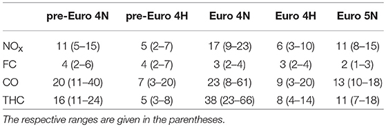 Table 1 presents the mean and standard deviation of NOx, CO, THC, and FC levels, as well as the ratios over the respective limits, for each technology group. The two statistics are calculated on the basis of the mean emission level of each vehicle within each category. Fuel consumption rates were estimated using the standardized carbon balance equation (UNECE Regulation 101, 2013). All pre-Euro 4 and four out of five Euro 4R vehicles exhibit NOx emission levels higher than 1 g/km. For comparison, Euro 5 diesel passenger cars, which have been considered of being the highest NOx light duty vehicle emitters of all times (Ntziachristos et al., 2016), are below this level. Despite absolute levels drop with improving technology, Euro 4 vehicles remain above the corresponding NOx limit by 12 times on average (min-max: 3–25 times higher). Only Euro 5 LPG taxis are at or even below the corresponding limit, ranging from 59% lower to 82% higher than the limit. Euro 5 LPG taxis are generally younger than Euro 4 ones, i.e., the average test age of the Euro 5 and of the Euro 4 LPG taxis is 3.7 and 7.2 years, respectively.
