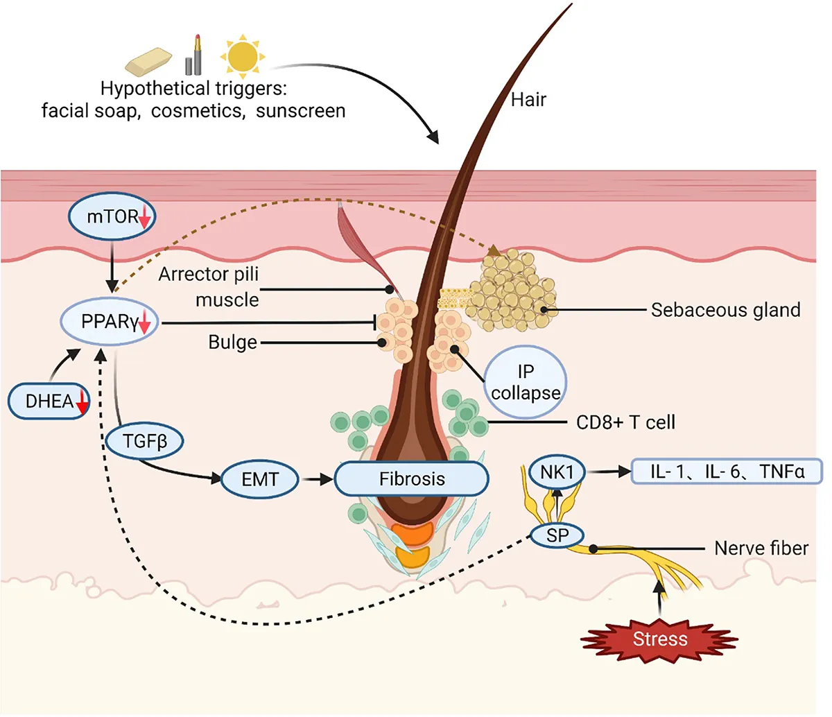 Different hypothetical triggers, such as facial soap, cosmetics, sunscreen, or stressful conditions, can cause FFA in potentially genetically susceptible individuals. PPAR-γ/TGF-β pathway plays an essential role in EMT and fibrosis. mTOR signaling works as a modulator of PPAR-γ activity and lipid homeostasis. Arrows and lines indicate a regular relationship between two elements mTOR: mammalian target of rapamycin; PPAR-γ: peroxisome proliferator-activated receptor γ; DHEA: dehydroepiandrosterone; HF: hair follicle; IFN: interferon; TGF-β: transforming growth factor-β; IP: immune privilege; EMT: epithelial-mesenchymal transition; SP: substance P; NK-1: Neurokinin-1. Created with BioRender.com (accessed on 7 February 2022).