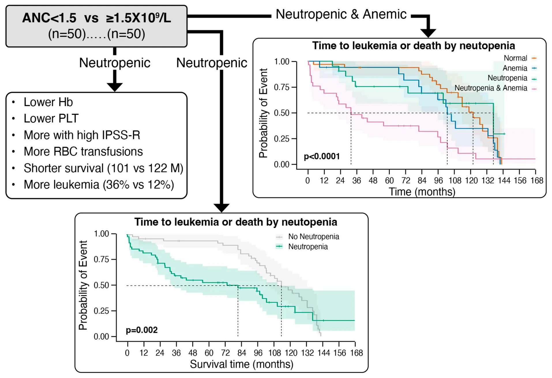 Both groups were similar: Age 74.8 years; 61% males; ECOG 0/1 (91%); comorbidities. In Neutp vs. Non-Neutp patients: Hb (9.8 vs. 10.9 g/dL); WBC (2.7 vs. 7.7 × 109/L); Lymphocytes (1.2 vs. 1.8 × 109/L); Monocytes (0.46 vs. 0.73 × 109/L); PLT (115 vs. 201 × 109/L). Ferritin was higher (642 vs. 304 ng/mL, p = 0.002). BM dyserythropoiesis was less (50% vs. 72%, p = 0.04), while dysmyelopoiesis (48% vs. 26%) and blasts (3.3% vs. 1.1%, p < 0.001) were more common. More Neutp patients (60.0%) were classified as HR-IPSSR than Non-Neutp (12.2%, p < 0.001). The median OS was shorter (101 vs. 122 m, but p = 0.12); 18 (36%) Neutp vs. 6 (12%) Non-Neutp patients transformed to AML (p = 0.002), with a shorter TTL (p = 0.002). The median time to composite endpoint (death or leukemic transformation) was 82 vs. 114 m (p = 0.035). In a Cox proportional hazard model, CVD affected OS, while cytogenetics and neutropenia affected leukemic transformation and composite outcome. Lymphocytes, monocytes and platelets had no impact on outcomes. Patients with only neutropenia or only anemia (HB < 10) had a small, non-significant impact, but patients with both had a profound impact on all outcomes (composite: HR = 4.15, 95% CI [2.25–7.7], p < 0.001).