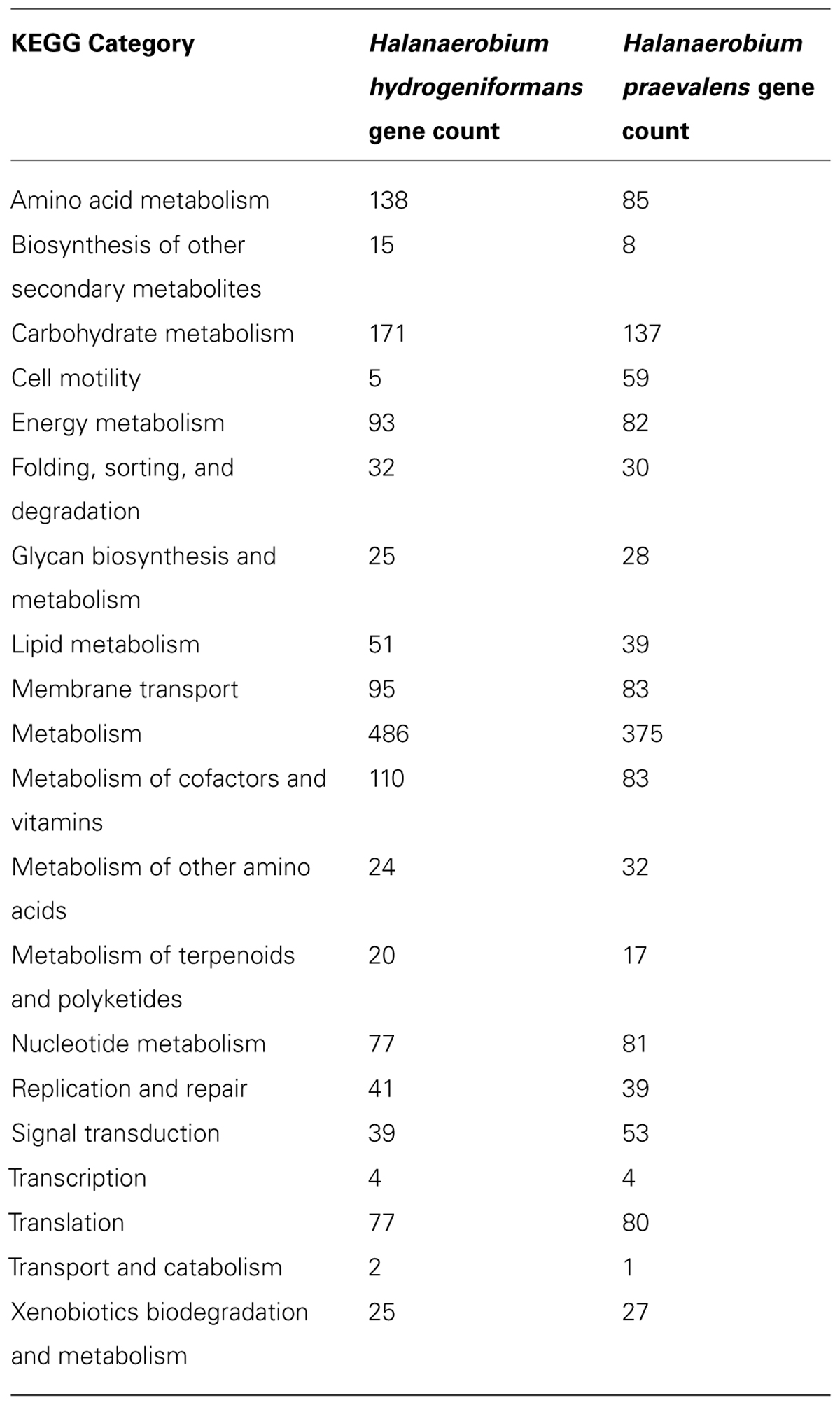 Of the 2391 candidate protein-encoding genes, there are 1867 with function predictions in the genome (Table 1). Four 5S rRNA, 16S rRNA, and 23S rRNA genes each are present as are 57 tRNA genes. There are 2082 genes assigned to clusters of orthologous groups (COGs). Interestingly, approximately 25% of the protein-encoding genes are for transmembrane proteins. The distribution of the genes into COG functional categories is provided in Figure 1 and Table 2. The gene count for the different Kyoto Encyclopedia of Genes and Genomes (KEGG) categories is similar between Halanaerobium hydrogeniformans and Halanaerobium praevalens GSLT except for a few categories (Table 2). Halanaerobium praevalens GSLT only has a gene count of 85 for amino acid metabolism while Halanaerobium hydrogeniformans has 138. Halanaerobium praevalens GSLT also has lower gene counts for the KEGG categories of metabolism and metabolism of cofactors and vitamins. On the other hand, Halanaerobium hydrogeniformans has a much lower gene count for KEGG category cell motility. Though both of these organisms are not considered to be motile, there are strains of Halanaerobium praevalens GSLT that are (Kobayashi et al., 2000 and Eder et al., 2001).