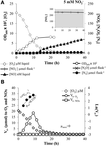 Figure 2. Kinetics of O2 and NO−2 respiration. (A) Absorbance at 600 nm (OD600), O2 consumption, NO−2 depletion (insert), and production of NO, N2O, and N2 by E. meliloti 1021 when incubated in the presence of 5 mM NO−2 in the medium and an initial O2 concentration of2% in the headspace. (B) The electron flow to O2 shown as log-transformed values for the phases with exponential increase (filled circle symbols). The slopes estimating apparent growth rates were 0.11 (±0.02) h−1 and 0 for oxic and anoxic phase, respectively. Cultures with an initial OD600 of 0.01 were vigorously stirred at 700 rpm. The result shown is for a single vial. Several replicates were analyzed, with similar results, although the exact timing of events was not the same. However, the consistency of the observations is demonstrated in Table 1 where averages of at least three different cultures are reported.