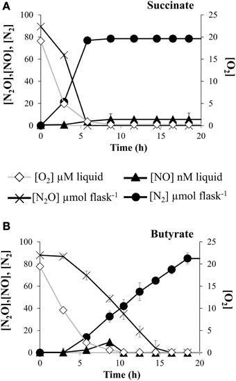 Figure 6. C-source effect on kinetics of O2 and N2O depletion. O2 and N2O consumption, and NO and N2 production by E. meliloti 1021 when incubated in the presence of 1% O2 plus 2 % N2O in the headspace, and 10 mM NO−3 in Robertsen's medium which contained succinate (A) or butyrate (B) as carbon sources. Cultures with an initial OD600 of 0.01 were vigorously stirred at 700 rpm. Plotted values are averages of three replicate flasks for each treatment, with standard deviation (SD) as vertical bars (n = 3).