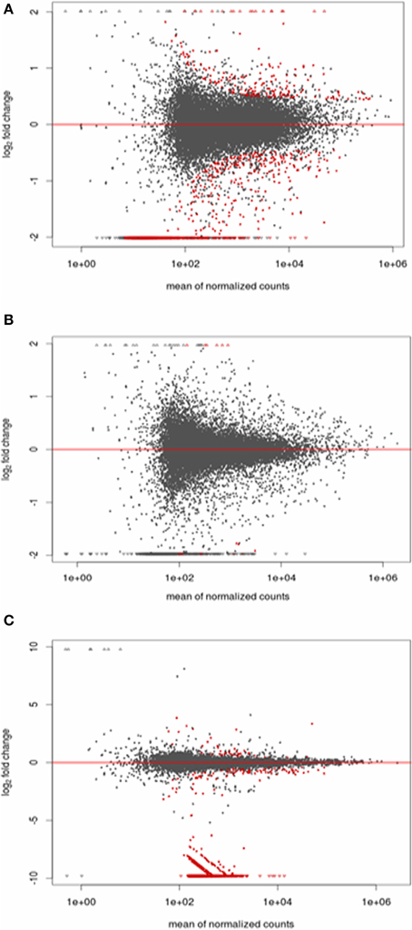 Figure 5. Plot of the normalized mean vs. the log2-fold change for the infected vs. non-infected conditions. Genes detected as differentially expressed are indicated in red. (A) Stimulated vs. non-stimulated 3 days post-bloodmeal; (B) infected vs. non-infected 10 days post-infected bloodmeal; (C) infected vs. non-infected 20 days post-infected bloodmeal.