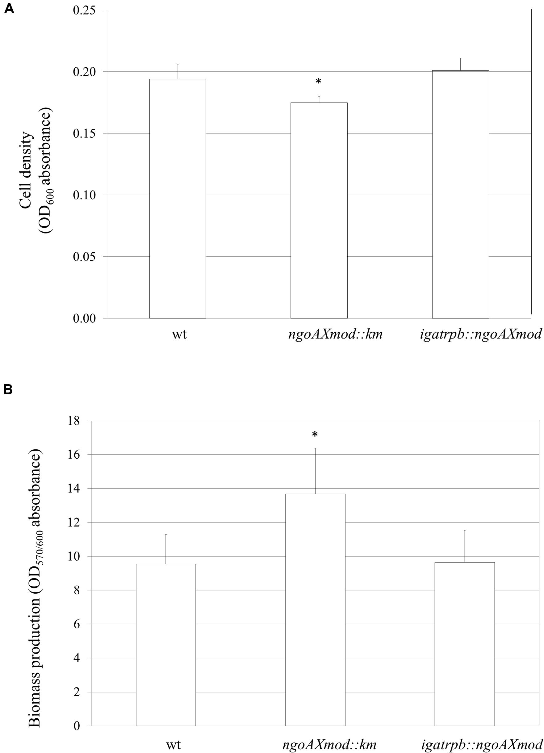 FIGURE 3. Growth and biofilm biomass of ngoAXmod::km and igatrpb::ngoAXmod N. gonorrhoeae mutants compared to the wt strain. Measurements were performed by crystal violet staining after a 24-h growth without shaking. (A) Biofilm and planktonic cell growth was measured at absorbance OD600; (B) Biomass production: ratio of cells that forms biofilm (OD570) versus total grown cells (OD600). Asterisks represent statistical significant differences in comparison to the wt strain (P < 0.05).