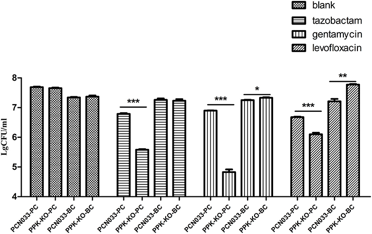 Figure 2. Antibiotic killing assay of planktonic and biofilm-grown cells. PCN033-PC indicates planktonic WT cells; PPK-KO-PC indicates planktonic cells of the Δppk mutant; PCN033-BC indicates biofilm-grown WT cells; PPK-KO-BC indicates biofilm-grown cells of the Δppk mutant; blank indicates no antibiotic treatment. ***p < 0.000, **p < 0.01, *p < 0.05.