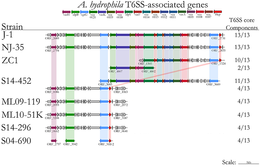 Figure 2. Type VI secretion system gene prediction using the T346 Secretion System Hunter, with results including strains included in the immersion catfish challenge (ML09-119, MNL10-51K, S04-690, S14-296, S14-452, and ZC1) and representatives from Chinese strains (J-1, NJ-35, and ZC1).