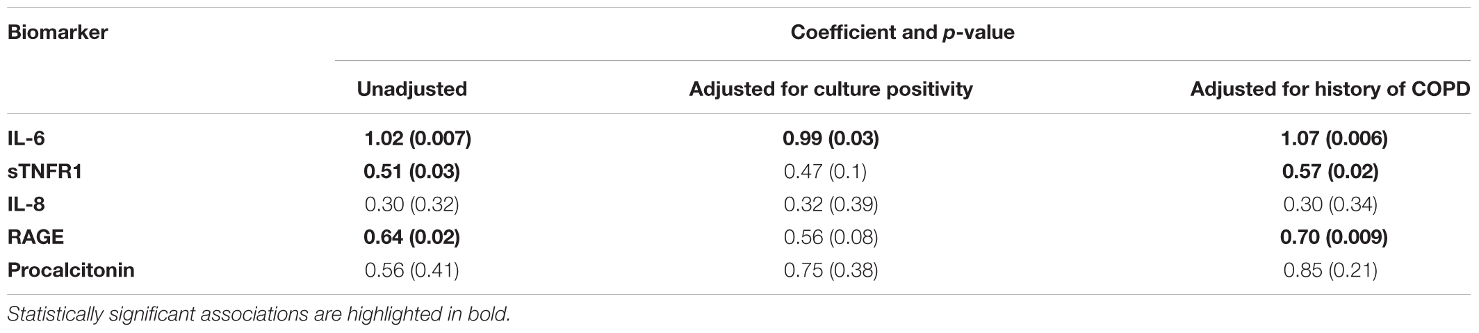 TABLE 2. Associations between pathogen abundance and host-response biomarkers in unadjusted linear regression models, and in adjusted models for culture positivity or history of COPD.
