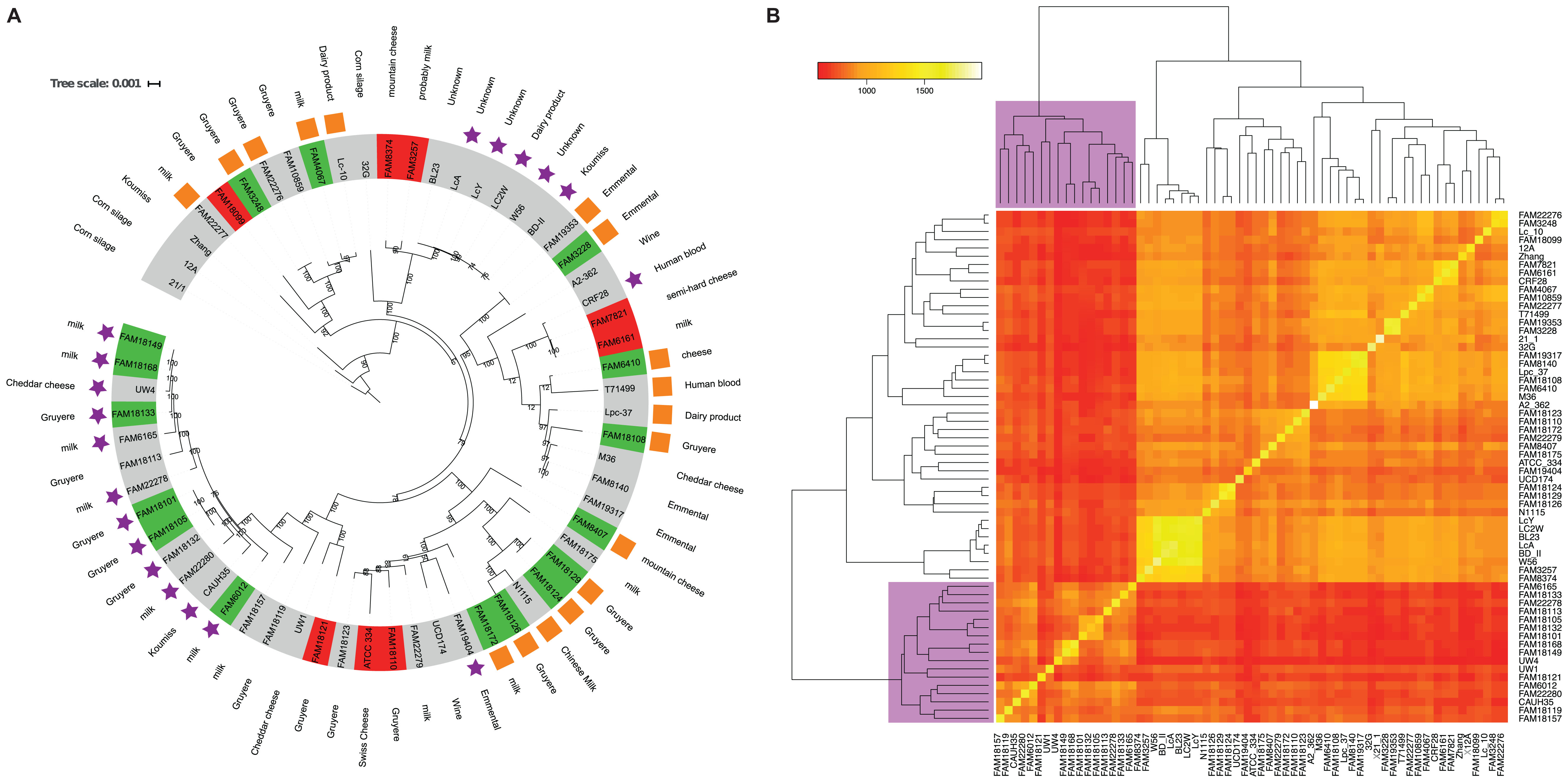 We sequenced the genomes of 40 L. paracasei strains from the Agroscope culture collection originating from dairy products to an average depth of coverage of about 1200× (Supplementary Table S1). In addition, we used the long-read technology of Pacific Biosciences to sequence six bacterial strains (FAM18149, FAM18121, FAM10859, FAM18099, FAM18101, and FAM3228) selected from the 40 strains. These six nearly complete genomes were used to order the contigs of the other genomes which allowed us to better perform comparative genomics tasks. It also allowed us to identify if a strain has plasmids. We applied a hybrid assembly with Illumina short reads and PacBio long leads, as the long reads generated with the PacBio C2 chemistry do not allow the use of the non-hybrid HGAP method (Chin et al., 2013). Nevertheless, we obtained almost complete genome assemblies, which consist of only a few scaffolds (3–21 scaffolds, Supplementary Table S1). The remaining 34 strains were assembled using Illumina short reads only. The median n50 of the assemblies is 63,528 bp which is comparable with the results of similar studies performed with L. paracasei (Broadbent et al., 2012; Smokvina et al., 2013). The scaffolds of the genome assemblies of these 34 strains were ordered according to the six nearly complete genome assemblies as well as publicly available complete genome assemblies. We performed ab initio annotation of all 40 genomes to identify the CDSs using Prokka (Seemann, 2014). The number of CDSs per genome ranges from 2,501 (FAM18132) to 3,078 (FAM3257) with a median of 2,930 CDSs (Supplementary Table S1).