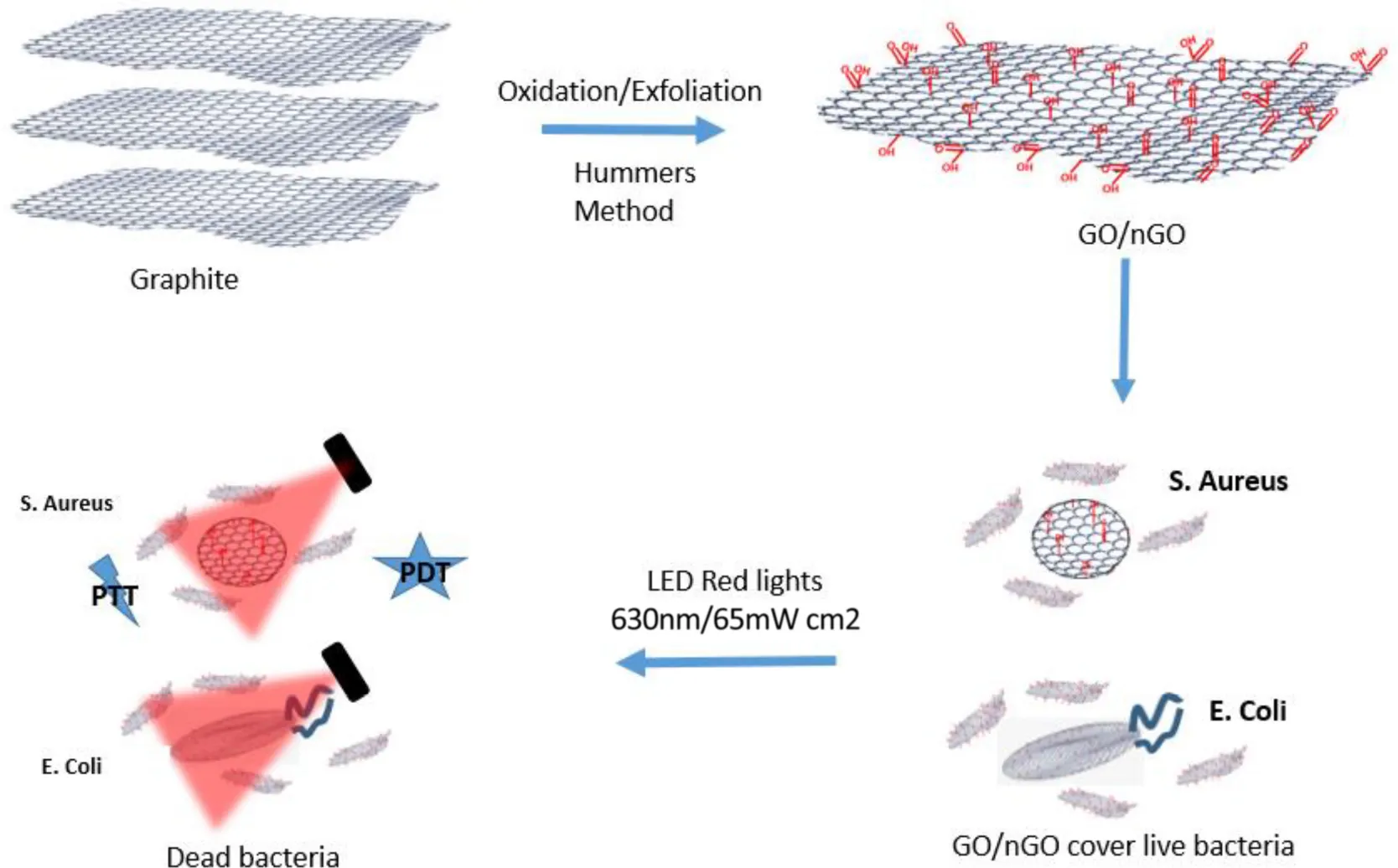 In this study, two sizes of GO were used to study the microbiological effects after illumination; and its cellular cytotoxicity was studied using a threshold dose analysis. It was shown that GO and nGO can exhibit wavelength-dependent photon excitation using a simple low-intensity LED array, that induces the generation of 1O2 and mediates the bimodal effects of PDT and PTT in the destruction of S. aureus and E. coli bacteria.