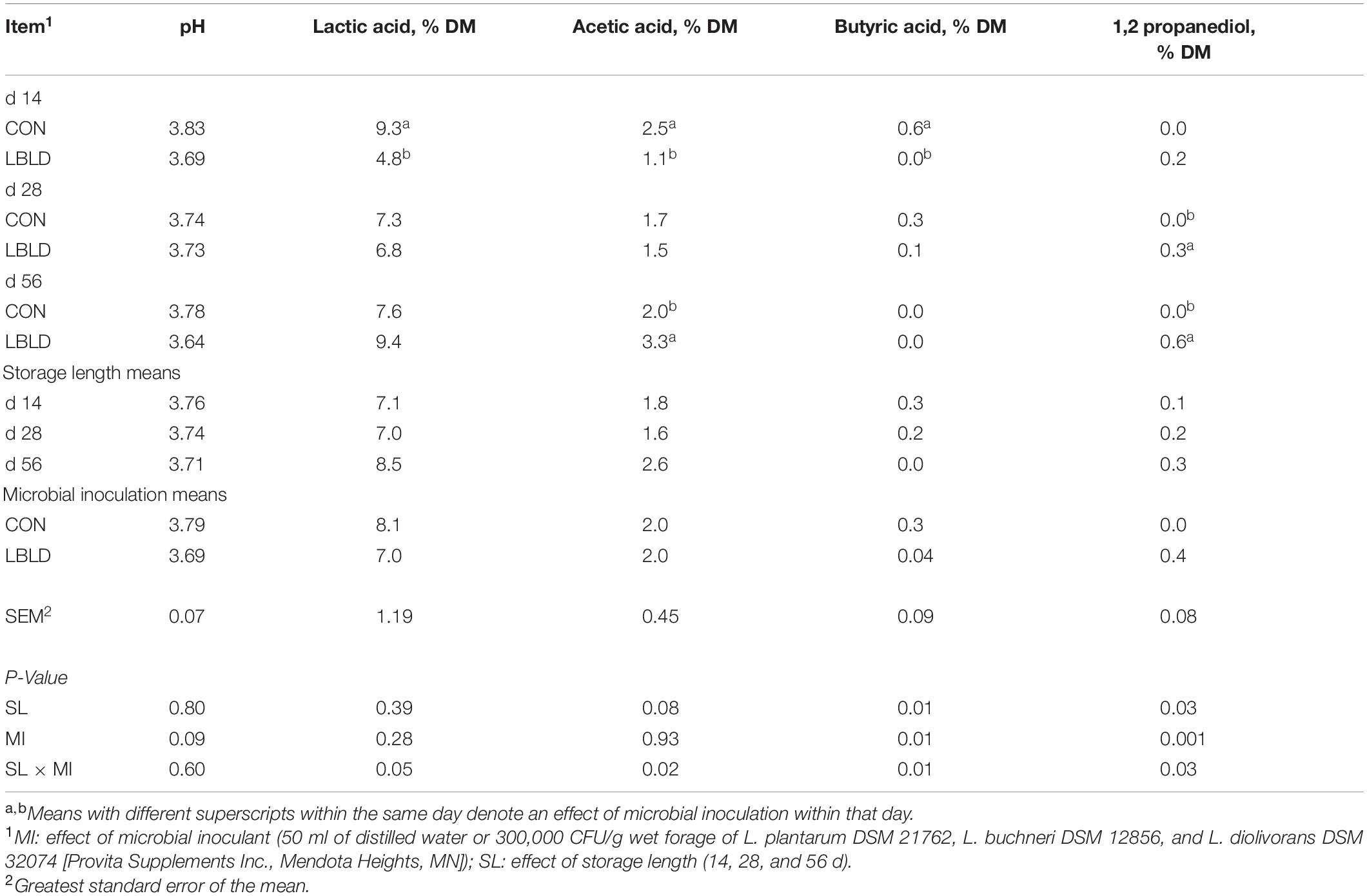 In experiment 1, the decrease in DM content with inoculation and storage length may be partially caused by L. diolivorans DSM 32074. It has been reported that water is produced as a byproduct of the degradation of 1,2-PD to 1-propanol or propionic acid (Zhang et al., 2010). Therefore, the numerical increase of propionic acid with inoculation and increasing storage length, along with the increase in 1-propanol concentration, probably contributed to water production in LBLD silage from the current study.
