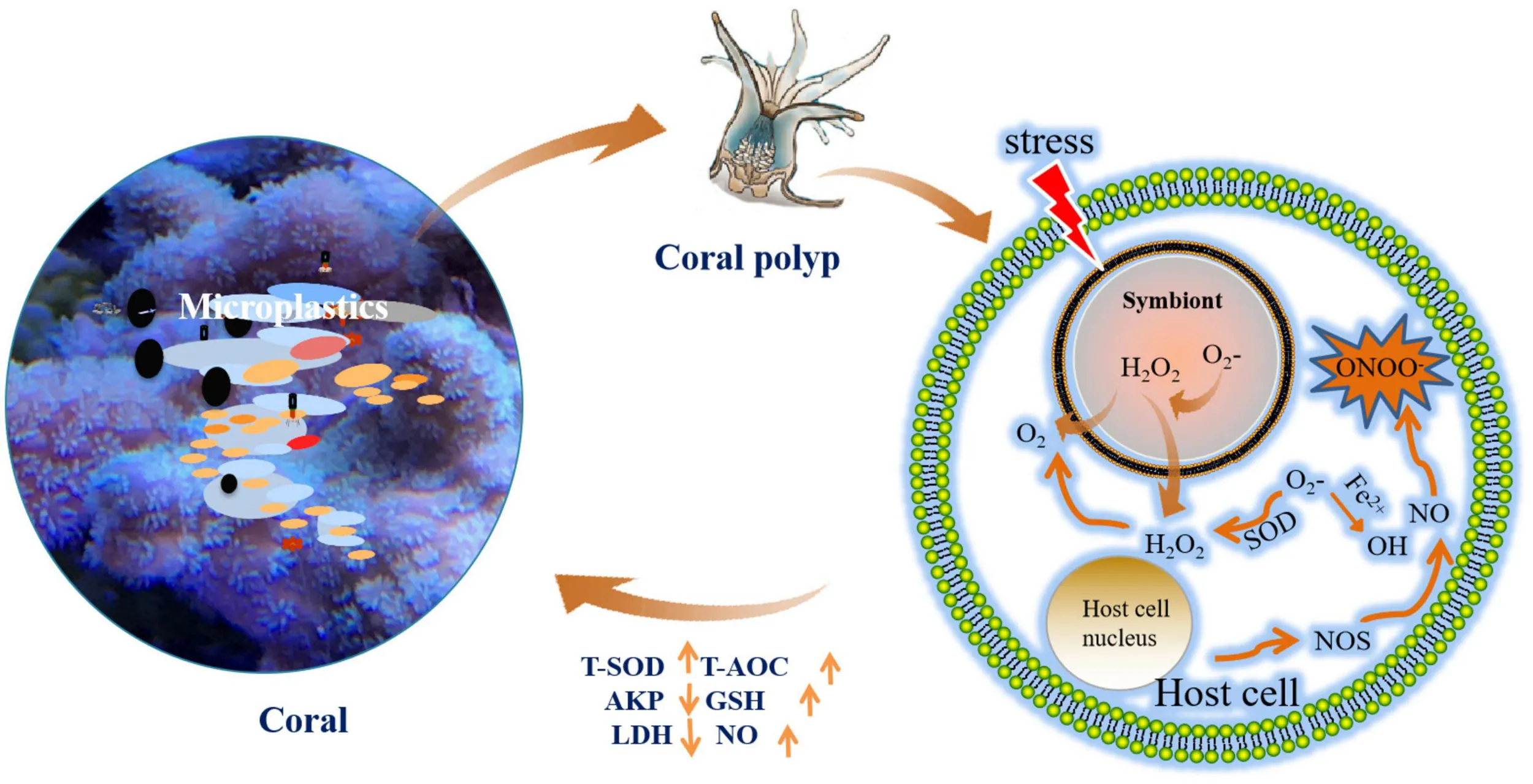 The present study aimed to provide detailed information about the physical and toxicity effects of MPs on corals. The scleractinian coral Acropora sp. was chosen to evaluate the effect of MPs. The biochemical level stress response of Acropora sp. was determined by the antioxidant enzyme (T-SOD, T-AOC, and GSH), immunocompetence [alkaline phosphatase (AKP), nitric oxide (NO)], phosphate pentoses pathway [lactate dehydrogenase (LDH), Glucose-6-phosphate dehydrogenase (G6PDH)]. This is the first study to assess the physiological responses of scleractinian coral exposed to MPs. It examines the activity of enzymes involving antioxidant capacity, immune response, and energy metabolism in different stages. The results provide new insights into the response of corals and stress reactions caused by different kinds of MPs.