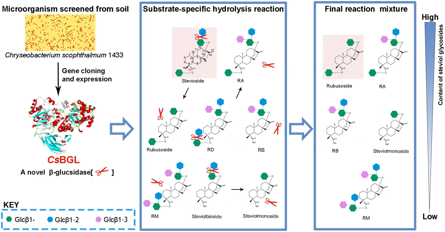 Schematic diagram of production of rubusoside from the hydrolysis of stevioside catalyzed by CsBGL. The blue numbers label the carbon atoms that link with the sugar groups, the different structural moiety between stevioside and rubusoside is displayed in red.