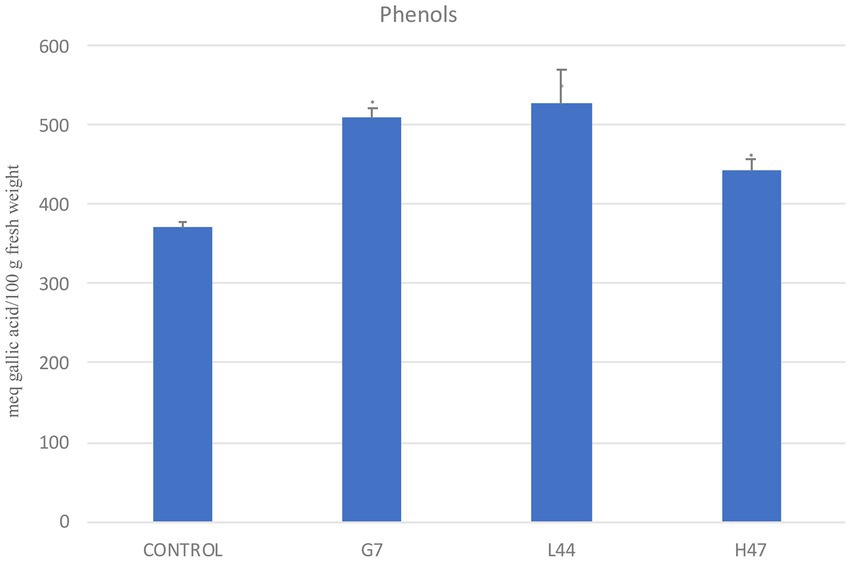 Figure 4. Total phenols (meq gallic acid/100 g fresh weight), in olive tree leaves treated with the three strains and non-inoculated controls. For each treatment and parameter average value ± SE value is presented (n = 6). Asterisks (*) represent significant differences with the control according to the T student test (p < 0.05).