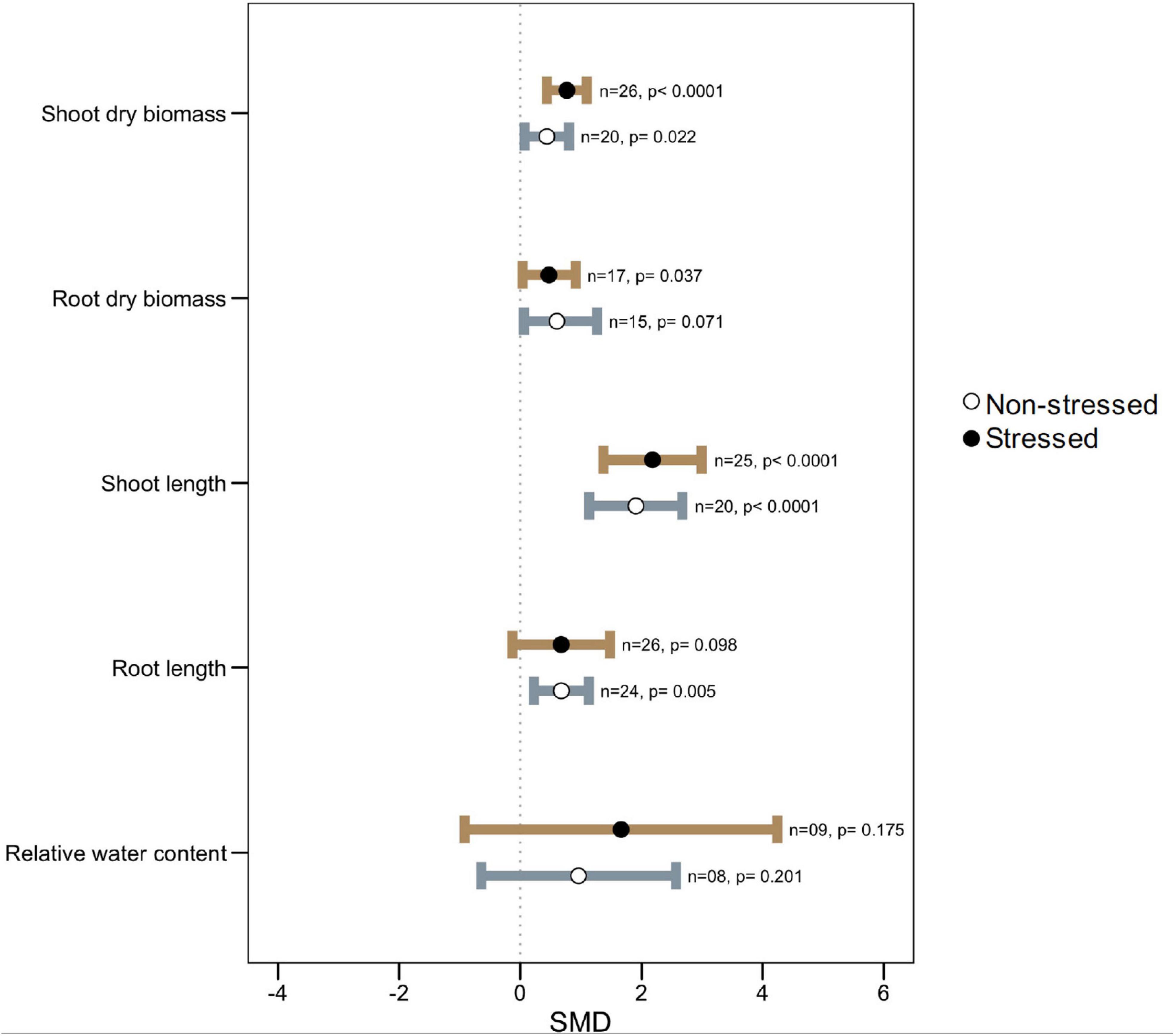 Figure 2. Growth responses of microbe-inoculated plants compared with those of non-inoculated plants under heat stress and non-stressed conditions. Error bars are effect size (SMD) means ± 95% CIs. Where the CIs do not overlap the vertical dashed lines, the effect size for a parameter is significant, i.e., the growth responses of inoculated plants were significantly different from those of non-inoculated plants. n = number of studies included in the meta-analysis, p = significance level of SMD.