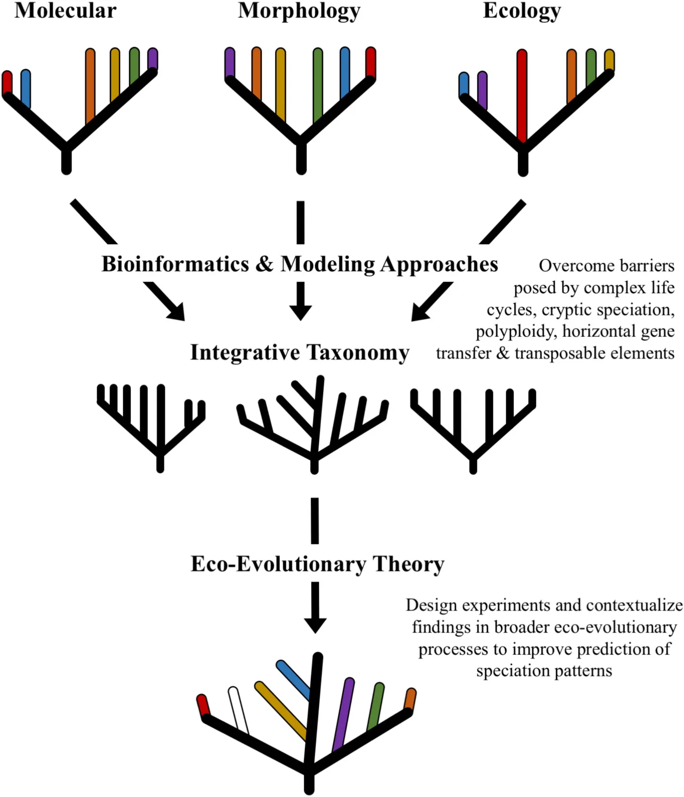 Similar to eco-evolutionary theory, integrative taxonomy is a conceptual framework that recognizes the roles of ecological and evolutionary processes in shaping species boundaries. Therefore, applying recent advances in eco-evolutionary frameworks for microbiome diversity with integrative taxonomy approaches offers great potential for improving research design and interpretation. In practice, integrative taxonomy aims to combine discipline specific observations with broad technical evidence to develop more holistic conclusions regarding evolution and species delimitation (Dayrat, 2005). This approach builds on coalescent theory (Avise and Wollenberg, 1997), combining criteria from various species concepts (e.g., biological, phylogenetic, morphological, etc.) in order to delimit taxa in a way that bridges disciplines and methods of study. Integrative taxonomy has also been referred to as a “multisource approach” (Schlick-Steiner et al., 2010) and has been applied across several eukaryotic lineages, with recent examples including plants (Prata et al., 2018), insects (Lamarre et al., 2016), and fish (Pugedo et al., 2016). Using eco-evolutionary theory to contextualize integrative taxonomy approaches will enable hypothesis testing which can improve discrimination of genetic, phenotypic, and functional traits that span the fungal tree of life. To better understand the utility of integrative taxonomy and eco-evolutionary framing for research, we highlight how key features of fungal biology have posed challenges for taxonomic delimitation and study. Keeping these challenges in mind, we then address how advances in sequencing, “omics,” bioinformatics, and modeling can be applied within the eco-evolutionary and integrative taxonomy frameworks to resolve fungal species boundaries.