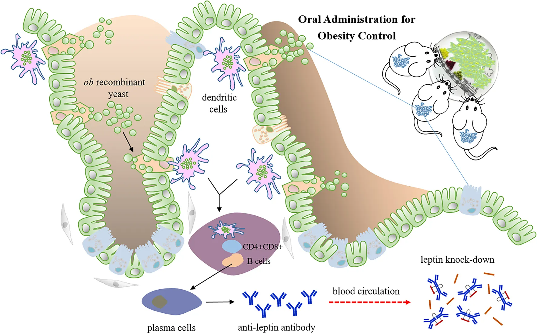 Oral administration of ob recombinant yeast mediated partial leptin reduction for diet-induced obesity control. When the whole yeast is uptaken by phagocytic cells in the gut, for example, dendritic cells, it is supposed to be lysed within the cells. The recombinant DNA vaccine cassette can be released, expressed, and further presented to lymphocytes, thereby activating the immune response.