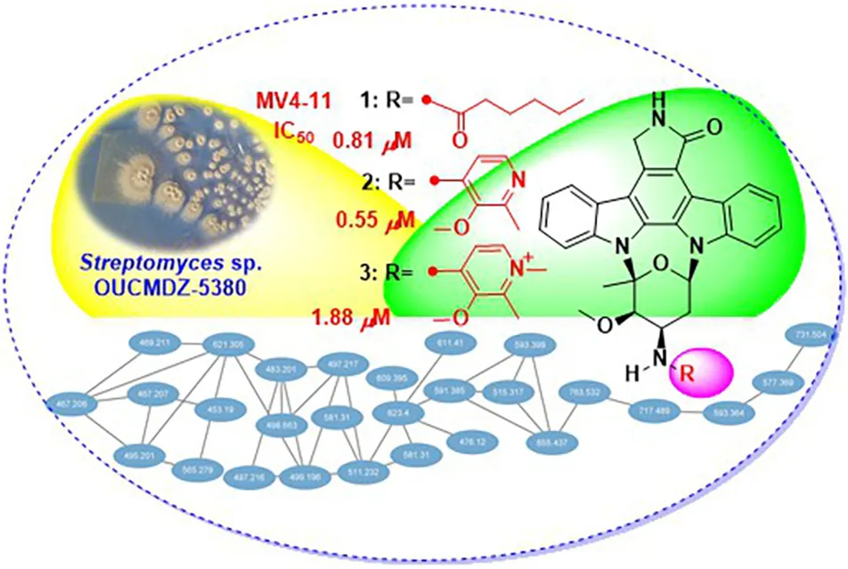 Staurosporine and its analogs are a special family of natural products with an indolo[2,3-a]pyrrolo [3,4-c]carbazole-12,13-diyl N-2-deoxy-1,5-glucopyranoside framework, which have attracted great attention because of the interesting structures and diverse bioactivities (Bergman et al., 2001; Sánchez et al., 2006; Janosik et al., 2008, 2018; Zenkov et al., 2020; Chambers et al., 2021). Since the first indolocarbazole, staurosporine was reported in 1977 (Ômura et al., 1977), more than 55 staurosporine derivatives have been isolated and identified from different organisms, namely, bacteria, clams, ascidia, slugs, and tunicates (Zenkov et al., 2020). Moreover, midostaurin (Stone et al., 2018), a staurosporine derivative, had been developed as the antitumor drug for the treatment of acute myeloid leukemia (AML). In recent years, the discovery of new compounds has been hampered due to the repeated isolation of known compounds. Therefore, dereplication becomes critical to finding new bioactive molecules. The LC-MS/MS-based global natural product social (GNPS) molecular networking can provide guidance and improve efficiency in the discovery of new and bioactive natural products within complex mixtures by analyzing and visualizing the spectral similarity of MS/MS data (Guthals et al., 2012; Watrous et al., 2012; Quinn et al., 2017). Molecular networking plays a significant role in exploring correlations of chemical structures among the known compounds, their analogs, and new compounds, which can guide the separation of the unreported compounds (Cheng et al., 2018).