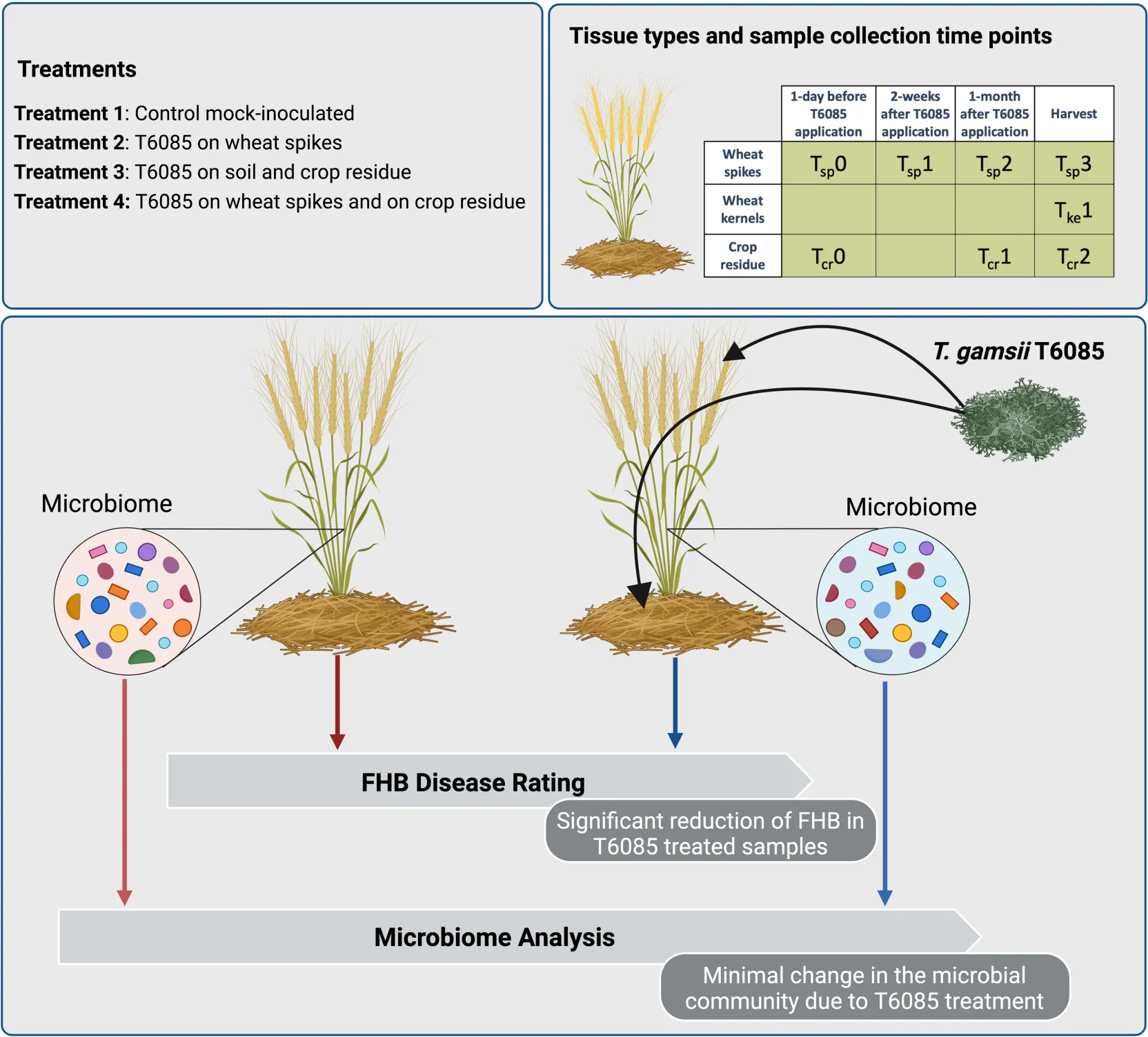 This study aimed to evaluate the impact of T6085 on the natural fungal and bacterial communities that interact with various wheat tissues. It is crucial to determine the non-target effects on the microbiome due to the artificial inoculation of a biocontrol agent, as these could affect both plant and soil health. Therefore, the microbial communities associated with different wheat tissues were profiled, and their dynamics were observed at different time points in response to different T6085 treatments.