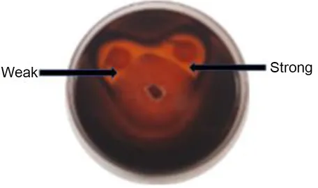 Exemplar images of the chitinase and glucanase plate screening showing yeast and Botrytis cinerea growth, enzyme production and weak or strong inhibition zone.