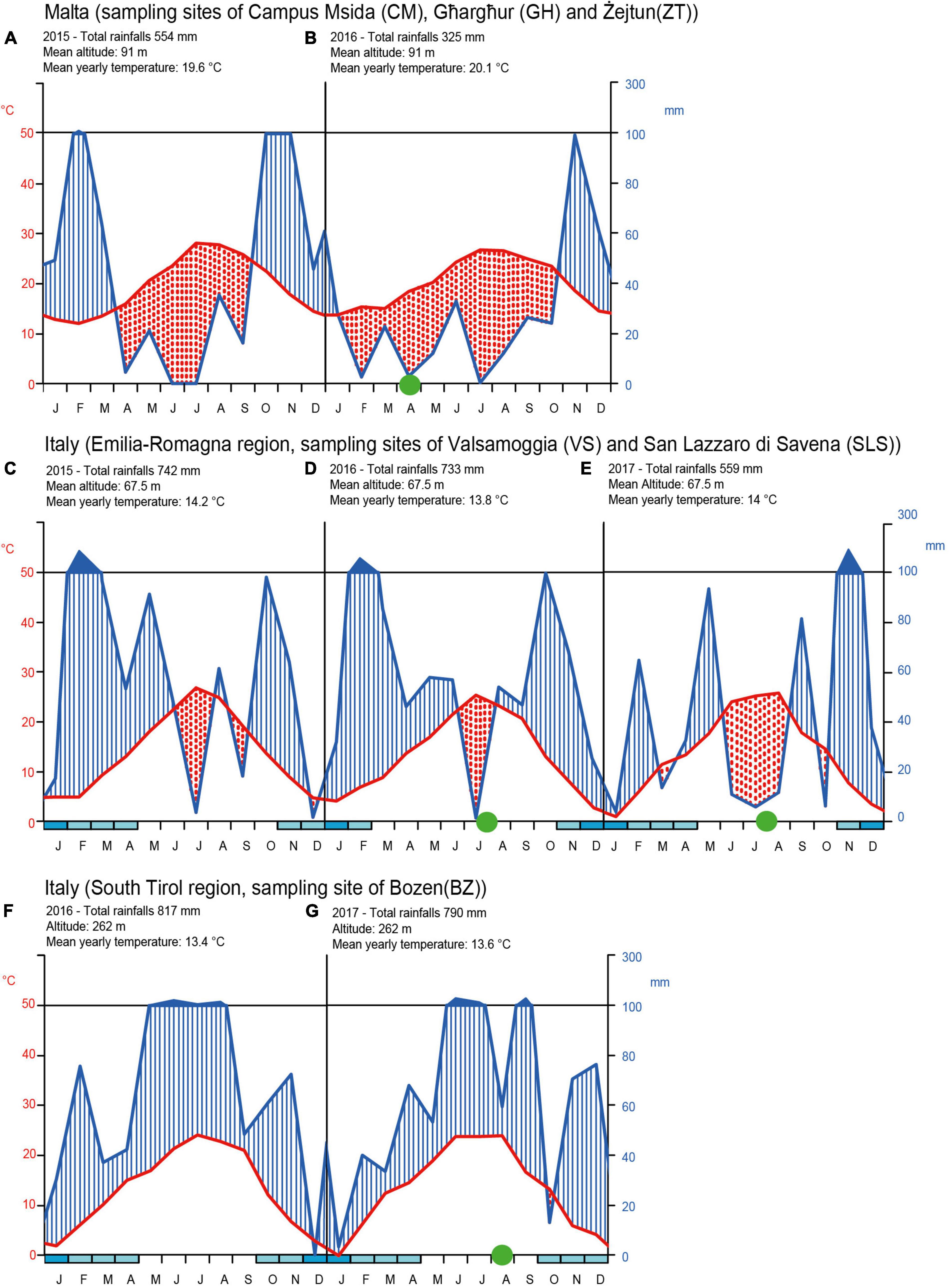 Figure 7. Walter and Lieth climate diagrams for drought periods in Malta (sampling sites CM, GH, ZT) in the years 2015 (A) and 2016 (B). In Italy for the Emilia-Romagna region sampling zones of VS and SLS in the years 2015 (C), 2016 (D), and 2017 (E). In Italy for the South Tirol region sampling zone of BZ the years 2016 (F) and 2017 (G). The diagrams shows on the x-axis the months of the year and on the ordinate the rainfall amount (on the right) and temperatures (on the left). The temperature values are shown on a scale double that of precipitation (1°C = 2 mm). When the precipitation curve (blue line) drops below that of the temperature (red line) the period concerned is considered as drought. Finally, if monthly rainfall values exceed 100 mm, the rainy period is represented ten times smaller than that previously adopted scale for rainfall lower than 100 mm. Blue marks in the x-axis represents period of intense frost. Green circles represent the honey bee sampling period for this work and for retrieved data from Alberoni et al. (2021a,b) and Baffoni et al. (2021).