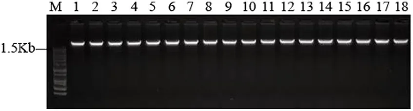 Agarose gel electrophoresis of the DNA. M: 1 Kb plus DNA ladder marker; 1–18: 18 strains of H. radicata.