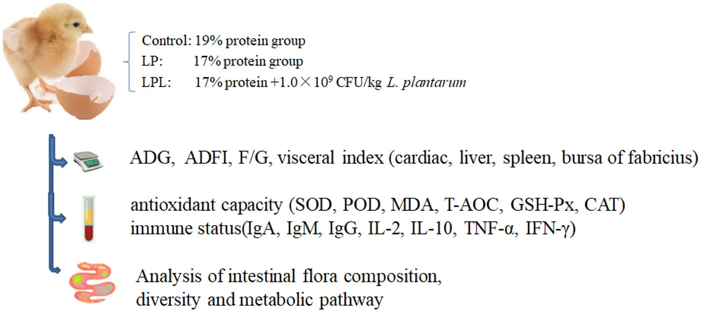 A total of 180 one-day-old healthy Hy-line brown laying chicks were randomly divided into three groups with three replicates each of 20 chicks. The control group was fed a basal diet containing 19% protein, the low-protein (LP) group was fed a diet containing 17% protein, and the probiotic (LPL) group was fed with the 17% protein diet supplemented with L. plantarum (1.0 × 109 CFU/kg) from laboratory of animal nutritional metabolic disease and poisoning disease. All experimental chicks were raised in ventilated buildings of chicken cage with up and down three floors, each floor three rooms, each room size is 100*80*50 cm, provided with continuous light, water and feed provided ad libitum during the feeding period of 21 days. The formulation and approximate composition of the basal diet and low-protein diet are shown in Table 1.