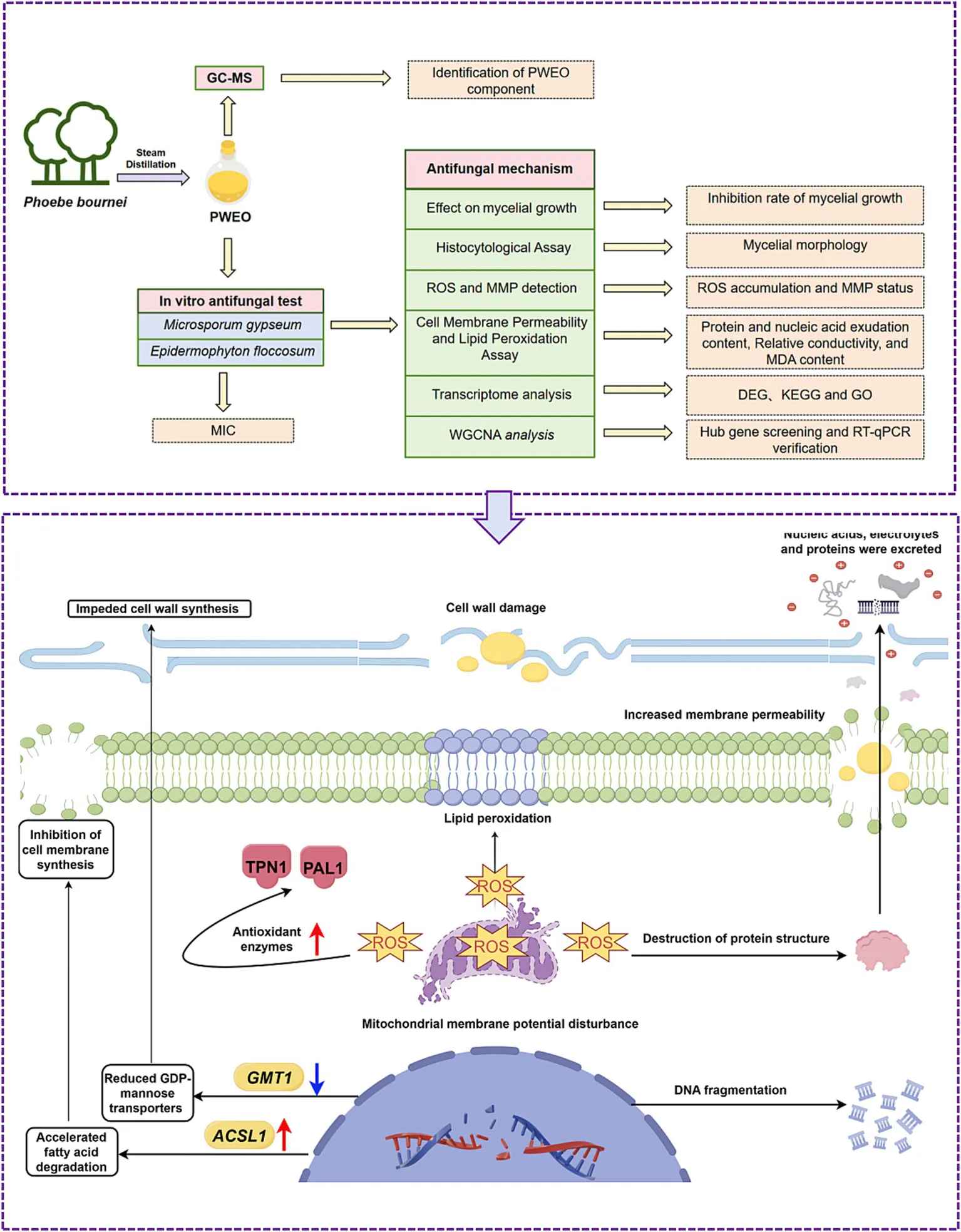 Determination of minimum inhibitory concentration (MIC) of PWEO on two dermatophytes (Microsporum gypseum and Epidermophyton floccosum) by broth microdilution method. Culture plates containing PWEO in vitro tested PWEO inhibition effect of mycelial growth of dermatophytes and the effect of PWEO on hyphal structure was observed by microscopy; the changes of cell membrane permeability and the degree of lipid peroxidation were reflected by measuring cell physiological indexes. ROS and MMP probe detection of intracellular ROS and MMP change. Finally, WGCNA analysis was used to identify and verify the key genes.