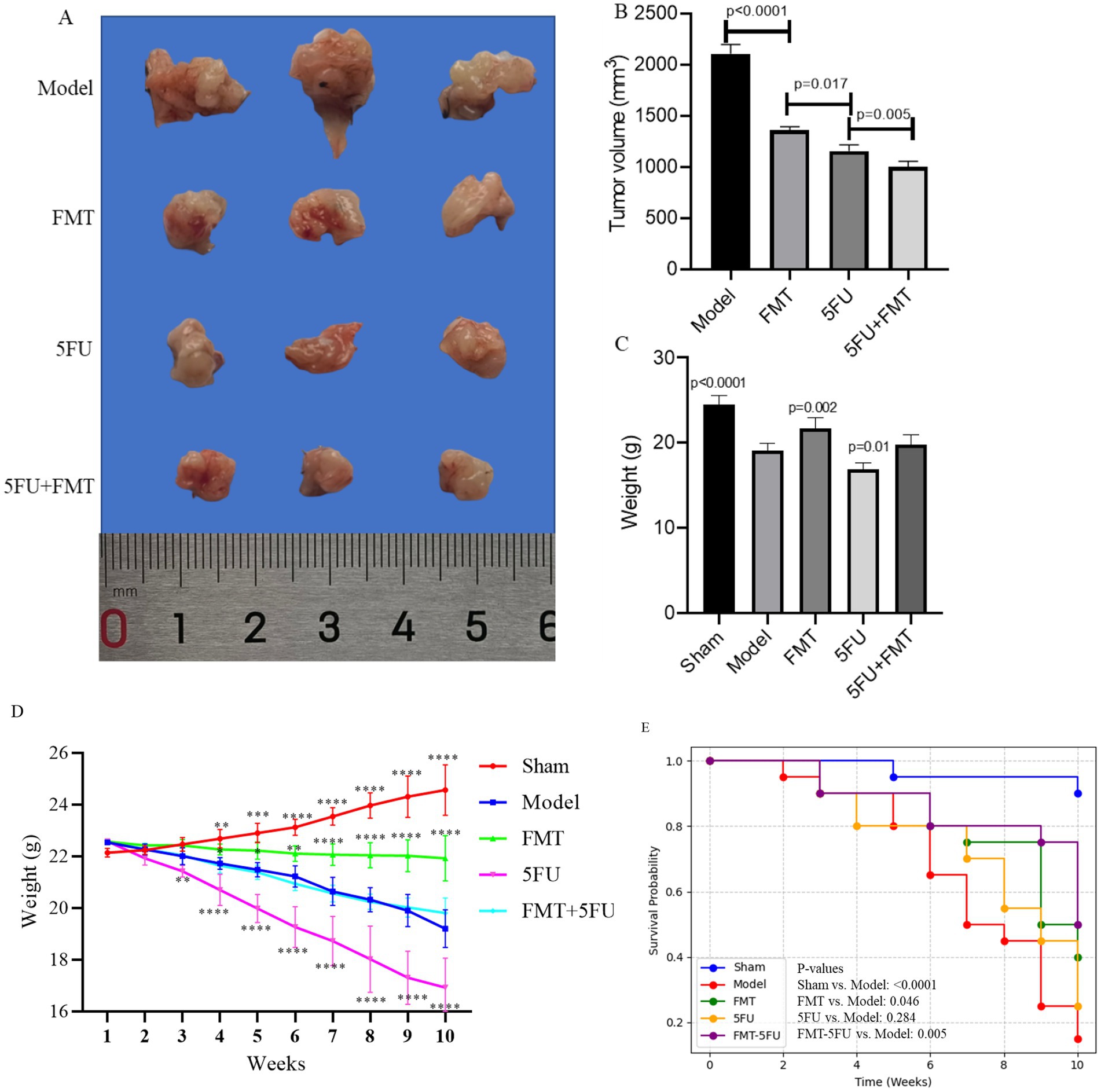 Figure 1C presents the final body weights of the mice after 10 weeks. The Sham group maintained the highest average body weight, reflecting the absence of tumor burden and the overall health of these mice. The Model group exhibited a significant reduction in body weight, likely due to the metabolic demands and cachexia associated with tumor growth (p < 0.0001). The FMT (p = 0.002) and 5FUgroups (p = 0.01) had higher or lower final body weights than the Model group, indicating that both treatments might have alleviated or induced some of the negative metabolic effects of the tumor. Although body weights in the FMT + 5FU group remained significantly lower than those in the Sham group, they were comparable to or slightly higher than those in the FMT or 5FU groups alone, indicating a potential synergistic effect in improving overall health.