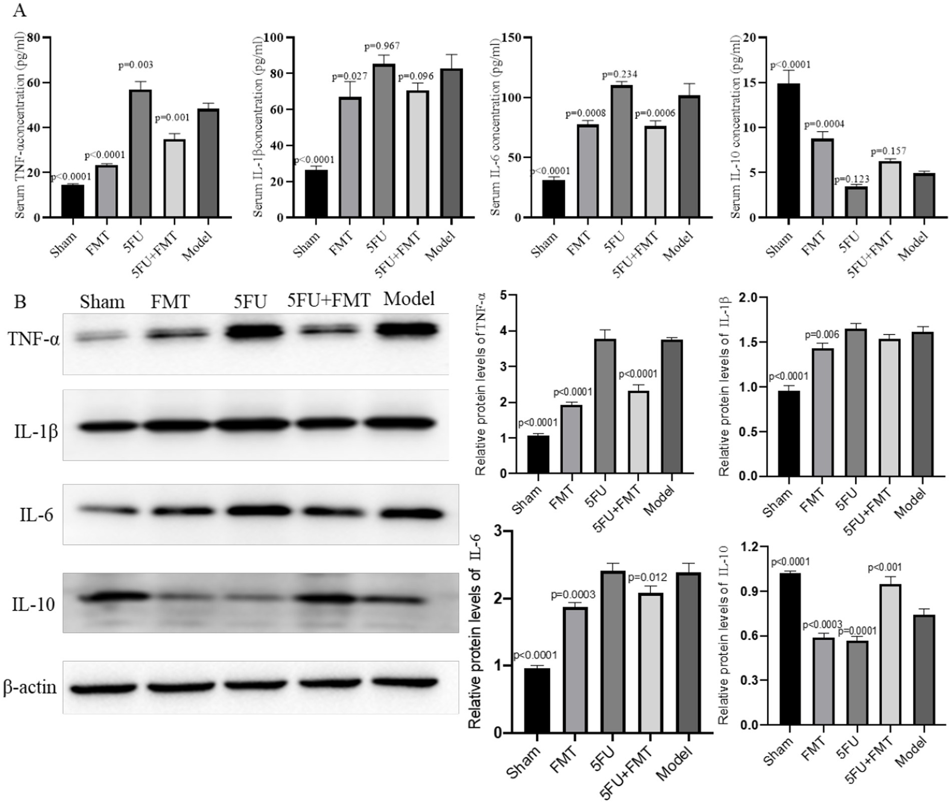ELISA analysis of serum cytokine concentration reveals significant variations in the levels of TNF-α, IL-1β, IL-6, and IL-10 among the different experimental groups (Figure 2A). TNF-α, a key pro-inflammatory cytokine, was significantly elevated in the Model group compared to the Sham group, indicating a heightened inflammatory response due to tumor presence (p < 0.0001). The FMT group showed a notable reduction in TNF-α levels compared to the Model group p < 0.05, suggesting that FMT may have an anti-inflammatory effect (p < 0.0001). The 5FU group exhibited increased TNF-α levels relative to the Model group (p = 0.003). The combination treatment group (FMT + 5FU) demonstrated the reduced TNF-α levels, indicating a potential synergistic effect in reducing inflammation (p = 0.001).