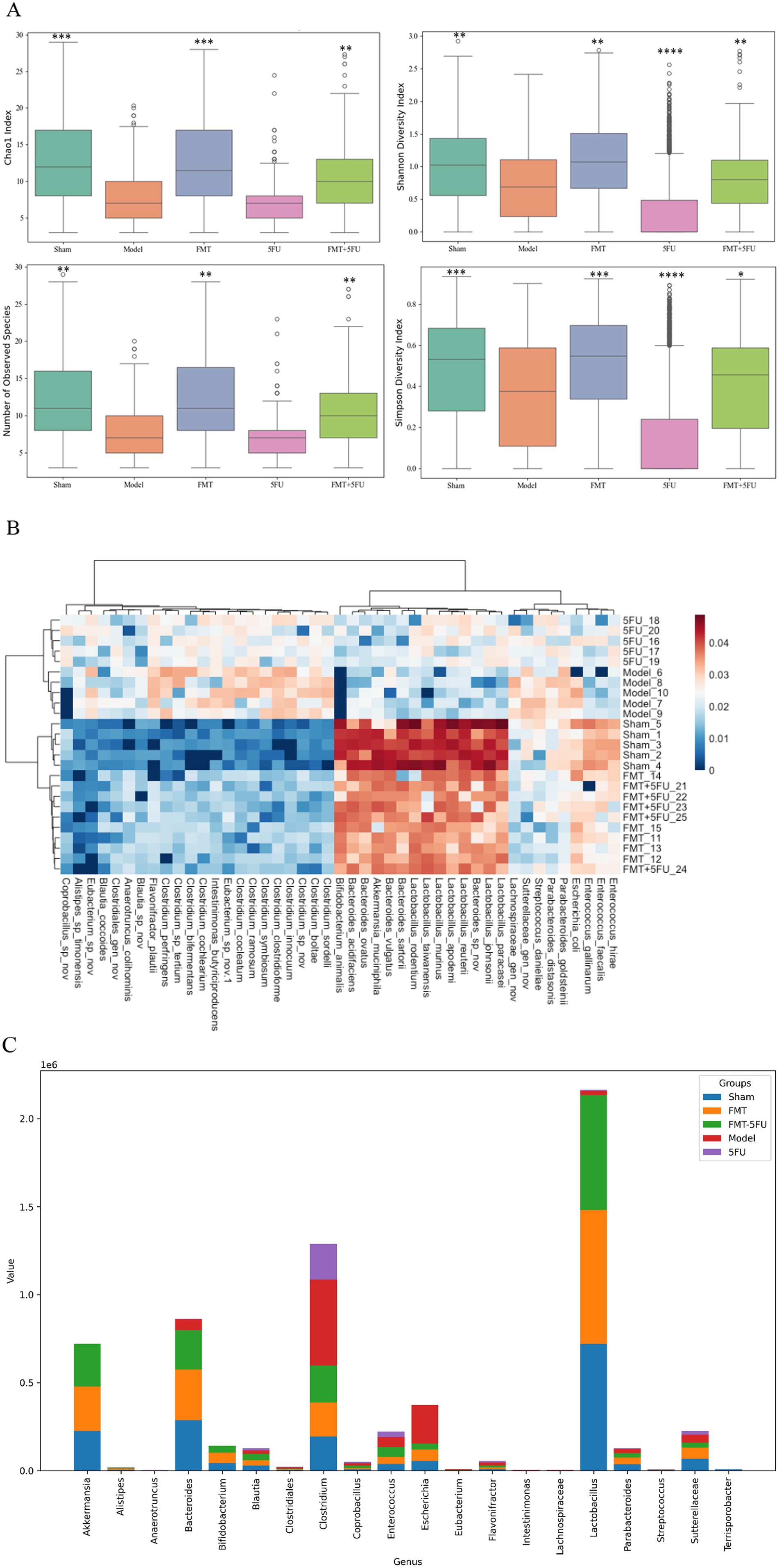 Figure 3. Analysis of gut microbiota diversity and composition across experimental groups. (A) Boxplots representing α diversity indices, including Chao1, Observed Species, Shannon Index, and Simpson Index, across the five experimental groups (Sham, Model, FMT, 5FU, and FMT + 5FU). These indices provide insights into the richness and evenness of the gut microbiota, indicating significant differences in microbial diversity among the groups. *p < 0.05, *p < 0.01, *p < 0.001 and *p < 0.0001 vs. the model group. (B) Heatmap illustrating the relative abundance of gut microbiota at the genus level across the five groups. The heatmap highlights distinct microbial signatures associated with each treatment, with clustering patterns reflecting the similarities and differences in microbial composition. (C) Bar chart showing the proportional distribution of specific gut microbiota genus among the five groups. The chart reveals how different treatments influence the prevalence of various bacterial genera, offering a detailed view of the microbiota shifts in response to the experimental interventions. n = 3 for each group. There were significant differences if p < 0.5.