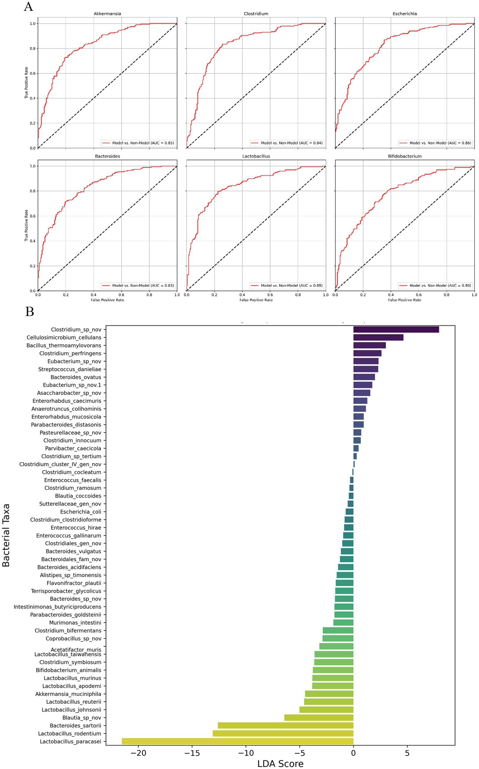 Figure 4. ROC curve analysis and LEfSe-like analysis of gut microbiota in pancreatic cancer mouse model. (A) Receiver Operating Characteristic (ROC) curves for six bacterial species (Akkermansia, Clostridium, Escherichia, Bacteroides, Lactobacillus, and Bifidobacterium) in the pancreatic cancer mouse model, showing the diagnostic performance of these species in distinguishing between different treatment groups. (B) LEfSe-like analysis displaying the Linear Discriminant Analysis (LDA) scores for various bacterial taxa, highlighting the most differentially abundant genera between the experimental groups. The LDA scores represent the magnitude of the differences, with Clostridium species showing the highest positive LDA score, suggesting a strong association with disease progression, while Lactobacillus and Bifidobacterium are more prevalent in groups with potential protective effects. n = 3 for each group.
