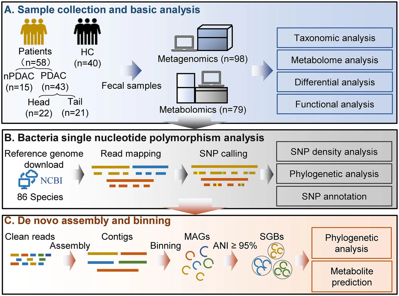 Here, we collected 98 fecal samples from 40 healthy controls (HC) and 58 pancreatic cancer patients, including 43 patients with pancreatic ductal adenocarcinoma (PDAC) and 15 with non-pancreatic ductal adenocarcinoma (nPDAC). PDAC patients were divided into three groups based on treatments: treatment-naive (UT, n = 15), chemotherapy (CT, n = 19), surgery combined with chemotherapy (SCT, n = 9). All CT or SCT patients who received chemotherapy were treated with 5-FU-based protocols. The minimum interval between the initiation of chemotherapy and sample collection was 20 days, and the shortest interval between surgery and sampling was 83 days, ensuring sufficient time to observe changes of gut microbiota. Additionally, PDAC patients were classified by tumor location into pancreatic head cancer (Head, n = 22) and pancreatic body/tail cancer (Tail, n = 21) (Table 1). Metagenomic sequencing and untargeted metabolome analysis were performed on fecal samples. Furthermore, microbial SNPs analysis was conducted to establish associations between SNPs and pancreatic cancer. MAGs were constructed separately for HC and pancreatic cancer patients by metagenomic binning to recover genomes for organisms that have yet to be isolated and cultured.