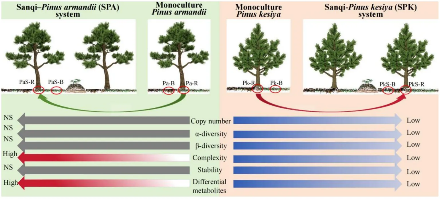 Hei J, Li Y, Rui R, Faisal N, Peng J, Wang B, Wang S and He X (2025) The cultivation of Panax notoginseng enhances the metabolites and microbial network complexity in the soil of Pinus armandii rather than Pinus kesiya. Front. Microbiol. 16:1616266. doi: 10.3389/fmicb.2025.1616266