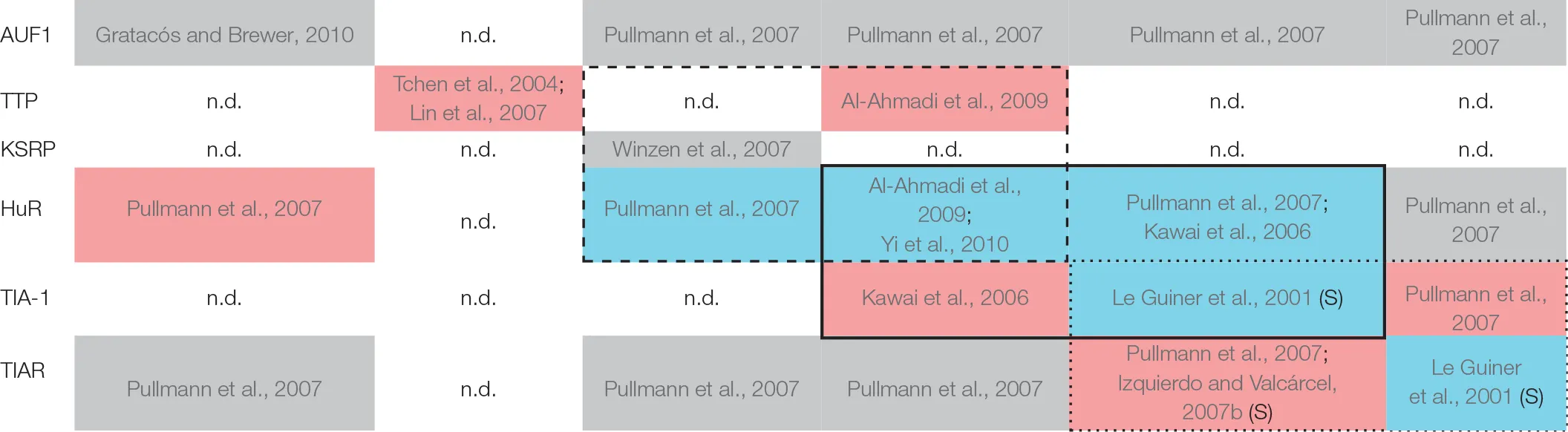 | KSRP | Chen et al., 2001; Gherzi et al., 2004 | Yamakoshi et al., 2010 | Trabucchi et al., 2009 | n.d. | Chen et al., 2001; Gherzi et al., 2004; Winzen et al., 2007 | n.d. | Winzen et al., 2007 | ||||