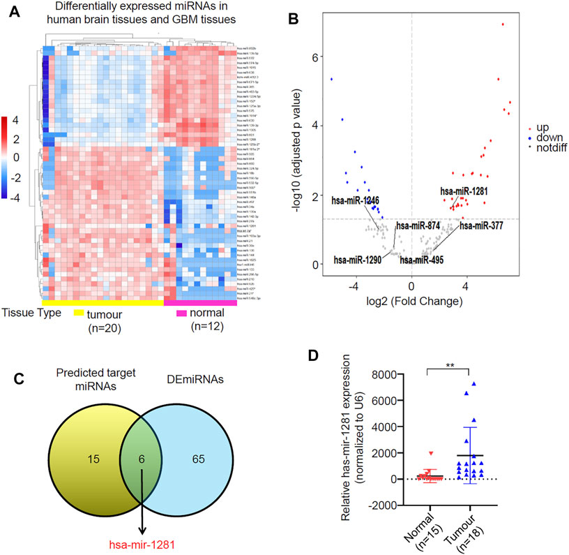 FIGURE 4. Identification of circRNAs-miRNAs axis. (A) Clustered heatmap showed profile of the differential expressed miRNAs in human brain tissues and GBM tissues. The color scale indicates the foldchange of the log2 value of the reads for each gene in tumors vs. normal tissues (red represents up-regulation; blue represents down-regulation). (B) Volcano plot of deferentially expressed miRNAs in GBM relative to normal brain tissues. The red dots represent upregulated miRNAs and blue dots represent downregulated miRNAs with statistical significance (|log2FC > 1 and p-value <0.05). (C) Identification of miR-1281 as the potential target miRNA of circLRRC7. (D) qPCR analysis of the expression levels of has-miR-1281 in normal and GBM tissue samples collected in our hospital. (**p < 0.01).