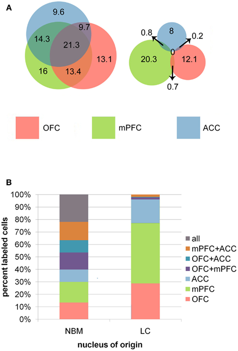 Figure 4. (A) Venn diagrams representing the relative sizes and degree of overlap between populations of projection neurons in NBM and LC. Overlapping regions correspond to populations of cells that projected to multiple PFC terminal field regions. Note the high degree of overlap between in NBM, representing a high proportion of double and triple labeled cells in this nucleus, whereas LC had very minimal overlap between the three populations of projection cells. Numbers indicate the mean number of cells per animal identified within each population. (B) The bar graphs illustrate the percentages of total retrogradely labeled neurons in NBM and LC that project to each possible combination of targets within the PFC.