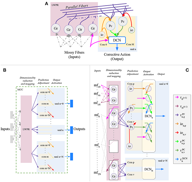 Figure 2. Proposed cerebellar-like circuit in analogy with D'Angelo et al. (2016). (A) canonical micro-circuit. Proposed cerebellar-like neural network (B) structural partition and (C) details.