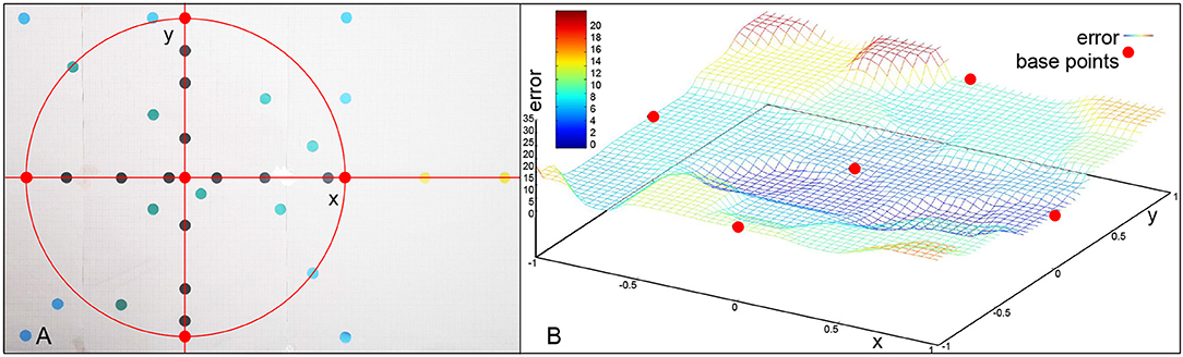 Figure 7. (A) Different points evaluated in the experiments. (B) Error values over target area and error values for learned base points (red). Outside of the circular area encapsulated by the base points, the error increases significantly.