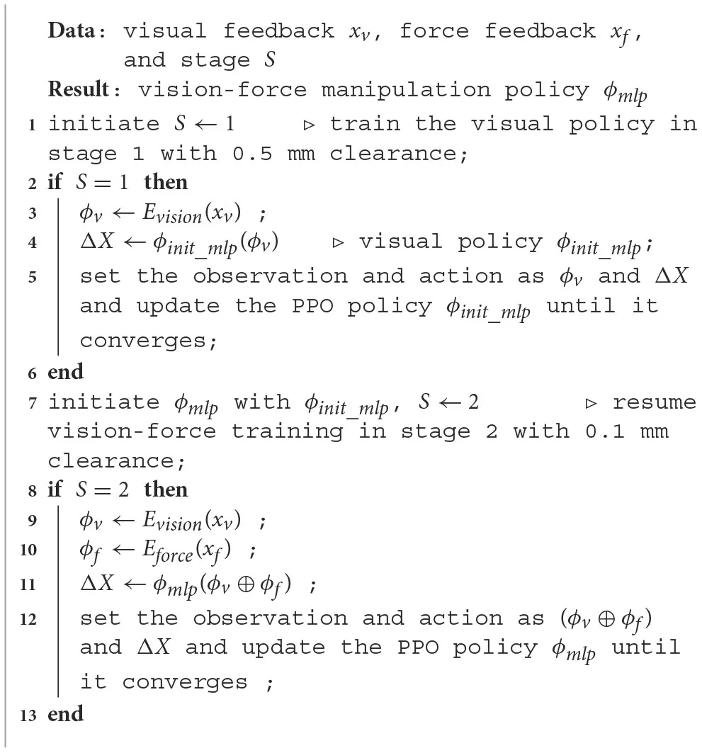 The CL approach divides the training process into two stages: the pure visual policy learning stage and the continued vision-force policy learning stage (shown in Figure 4 and Algorithm 1). The observation space of the first stage contains only 128-dimensional visual feature ϕv (Section 4.1), and the larger peg-hole clearance makes this stage of the task easier to manipulate. The difficulty of the second stage intensifies by narrowing the peg-hole clearance to 0.1 mm. We extend the observation space to 158 dimensions by combining the 30-dimensional force feature ϕf (Section 4.1). The visual strategy learned in the first stage provides a rough translational and rotational relationship between the grasped peg and the hole. After mastering the required skills in the first stage, the robot proceeds to train in more challenging scenarios incorporating force data. The training in the second stage is like fine-tuning the global visual policy with the local contact force. The action space ΔX for both stages is a 4-dimensional vector representing the desired displacements along x, y, and z axes, and the z-axis rotation roll in the object frame (ΔX = [Δx, Δy, Δz, Δθ]). Meanwhile, to achieve compliance along the z-axis, we command the interaction force along the z-axis to be zero. The Cartesian motion/force controller proposed in Lin et al. (2022) executes the motion and force commands.