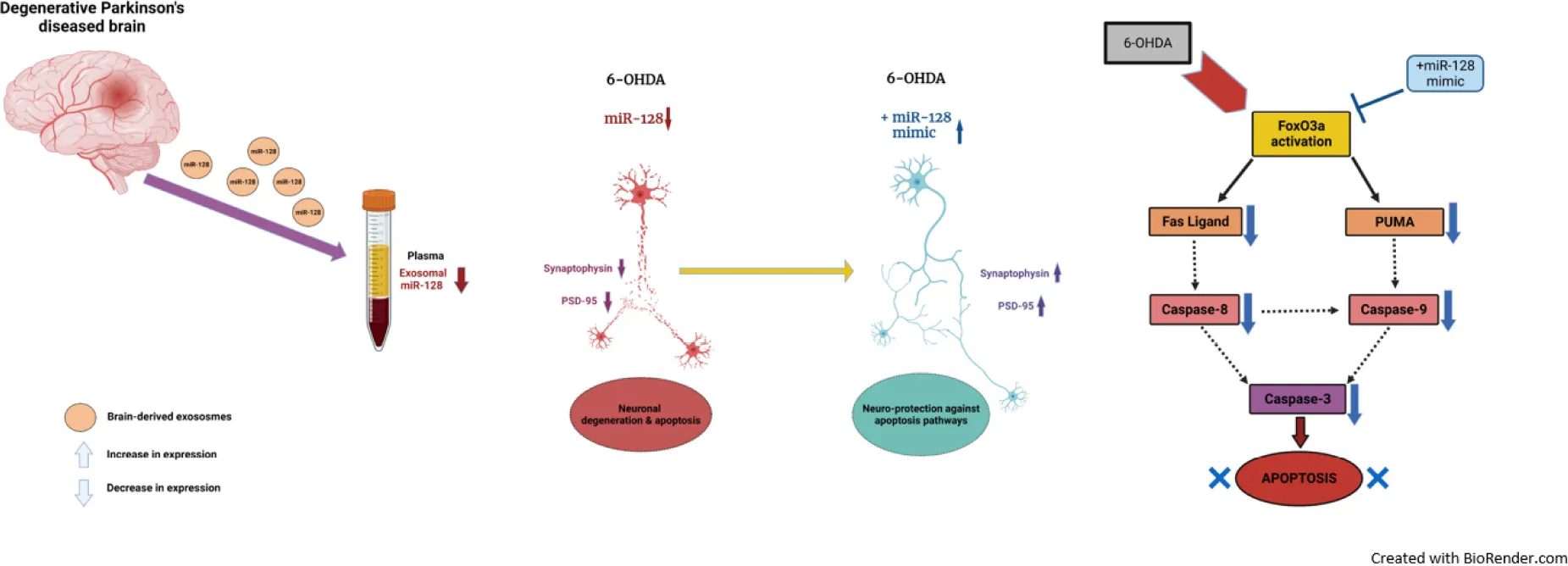 In the present study, we identified the expression of miR-128 to be characteristically reduced in the circulating exosomes derived from the blood (plasma) samples of a PD patient cohort. Since miR-128 is a neuron-enriched miRNA, we decided to corroborate whether the altered extracellular expression pattern of the miRNA is also associated with dysregulated intracellular diseased states in cellular models of PD. We found that miR-128 can prevent 6-OHDA-mediated neuronal death by inhibiting both the intrinsic and extrinsic pathways of apoptosis downstream of the activation of the transcription factor, FoxO3a. miR-128 was also instrumental in maintaining neurite formation and synaptic integrity, showing neuroprotective functions overall.