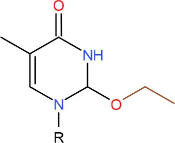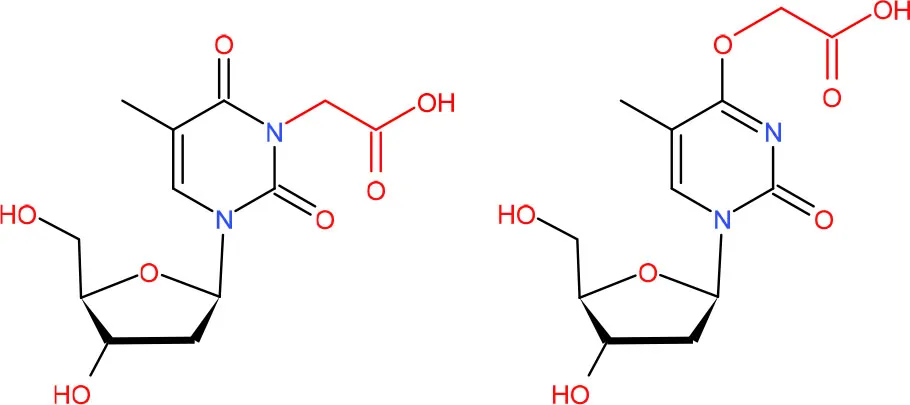 ![]() Left: N3-carboxymethyl-thymidine N3-(CMT) Right: O4-carboxymethylthymidine (O4-CMT) | TLS in mitotic cells (Wu et al., 2017) | Strong pausing (You et al., 2015) | N.D. | N.D. | N.D. | Slow bypass and transcriptional mutagenesis (You et al., 2015) | N.D. |