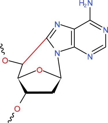 ![]() 2-Deoxyribonolactone (dL), oxidized form of AP site | BER (Sung and Demple, 2006) | Strong pausing (Wang et al., 2006) | (– –) (Wang et al., 2006) | N.D. | N.D. | TC-NER initiation (Wang et al., 2006) | N.D. |