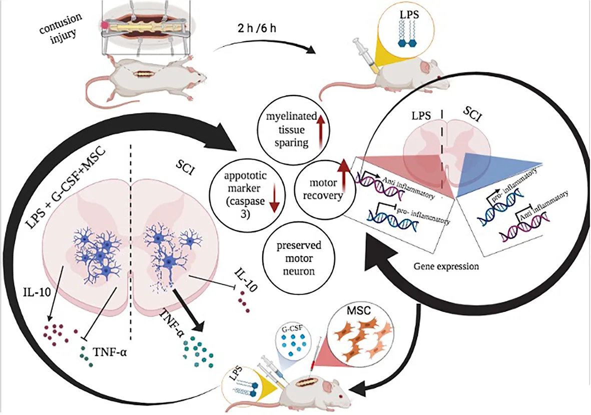 Following spinal cord trauma, a robust inflammatory response was observed. The first wave of inflammation is associated with the pro-inflammatory macrophage (M1) and reaches the peak at 7 days post-sci. The second wave corresponds to the anti-inflammatory macrophage (M2) and is maintained at least until 180 days after SCI (Milich et al., 2019). Evidence has demonstrated that the pro-inflammatory microenvironment of the injured spinal cord at the acute phase has a prominent negative impact on transplanted cells and limited therapeutic effects of BM-MSCs after transplantation (Beck et al., 2010). Research showed that early management of SCI is necessary to improve neurological recovery after SCI (Varma et al., 2013). To enhance the potential of transplanted MSCs, it is substantially important to modulate the microenvironment at the acute phase by altering inflammatory reactions. We hypothesized that the modification of the severe inflammatory processes in the microenvironment of the spinal cord by LPS combined with G-CSF treatment before MSC transplantation may enhance the therapeutic effect of cell therapy.