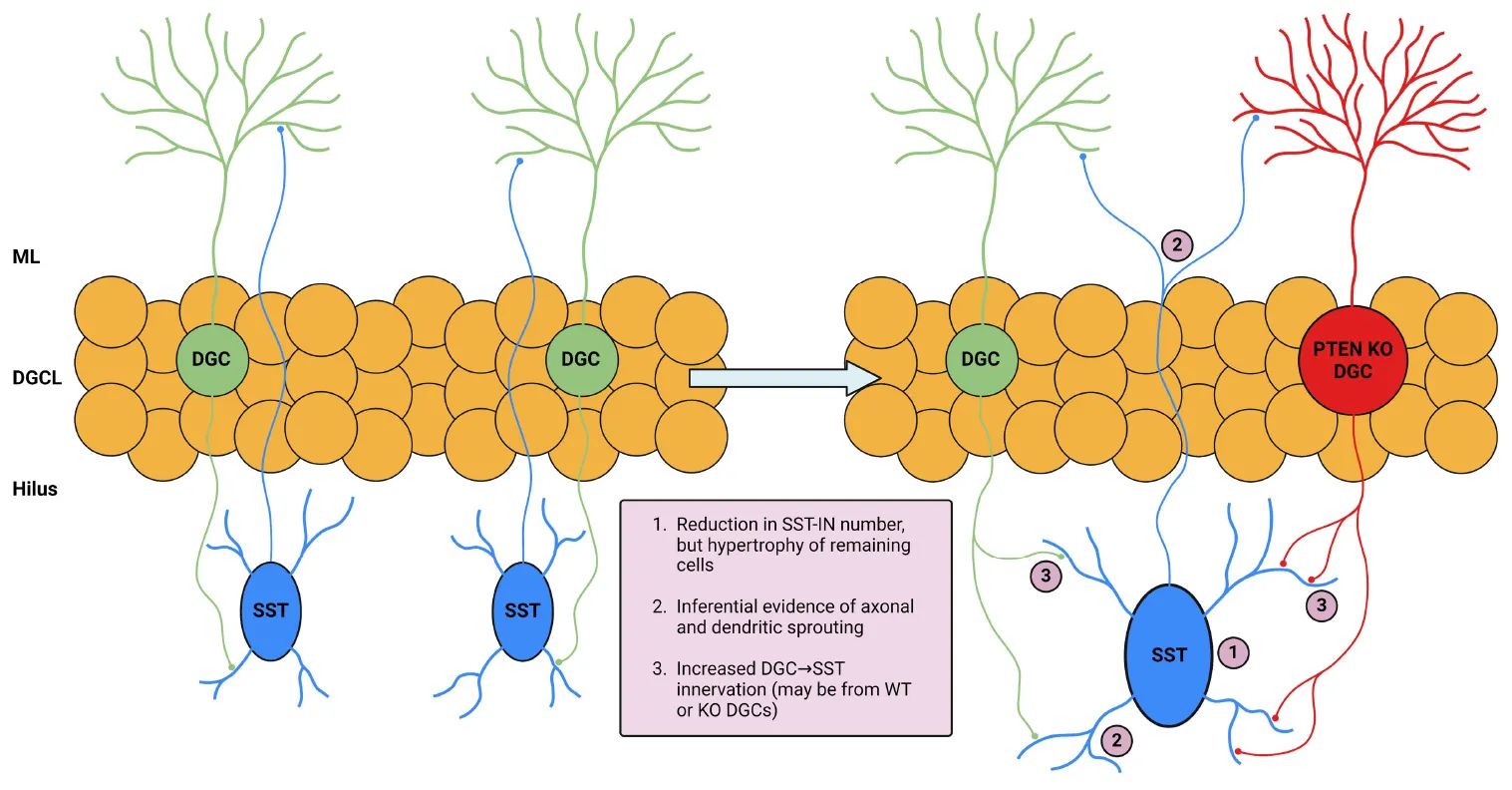 Illustration and summary of key study findings. The left portion of the illustration depicts DGC and SST interneuron interaction in normal conditions. The right portion depicts changes in the setting of DGC-Pten KO which are supported by the following findings in this study: (1) eGFP-SST cell density was reduced in multiple hippocampal regions. Remaining hilar eGFP-SST cells exhibited larger soma sizes. (2) Preserved eGFP-SST processes in the hilus and molecular layer, coupled with cell loss and an enlarged molecular layer, suggests sprouting. (3) Increased apposition of Znt-3 puncta to eGFP-SST processes suggests increased DGC innervation of SST interneurons. Created in BioRender.com. BioRender.com/h33m167.