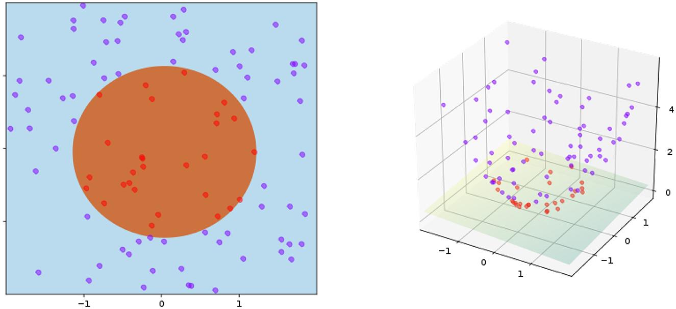 Figure 3. Kernel trick in the inner product space (left: input space, right: feature space). The kernel is given by ϕ((a, b)) = (a, b, a2 + b2) and K(x, y) = x · y+ ∥ x ∥2 + ∥ y ∥2. Training points are mapped to a 3-dimensional space, where a separate hyperplane can be easily found.