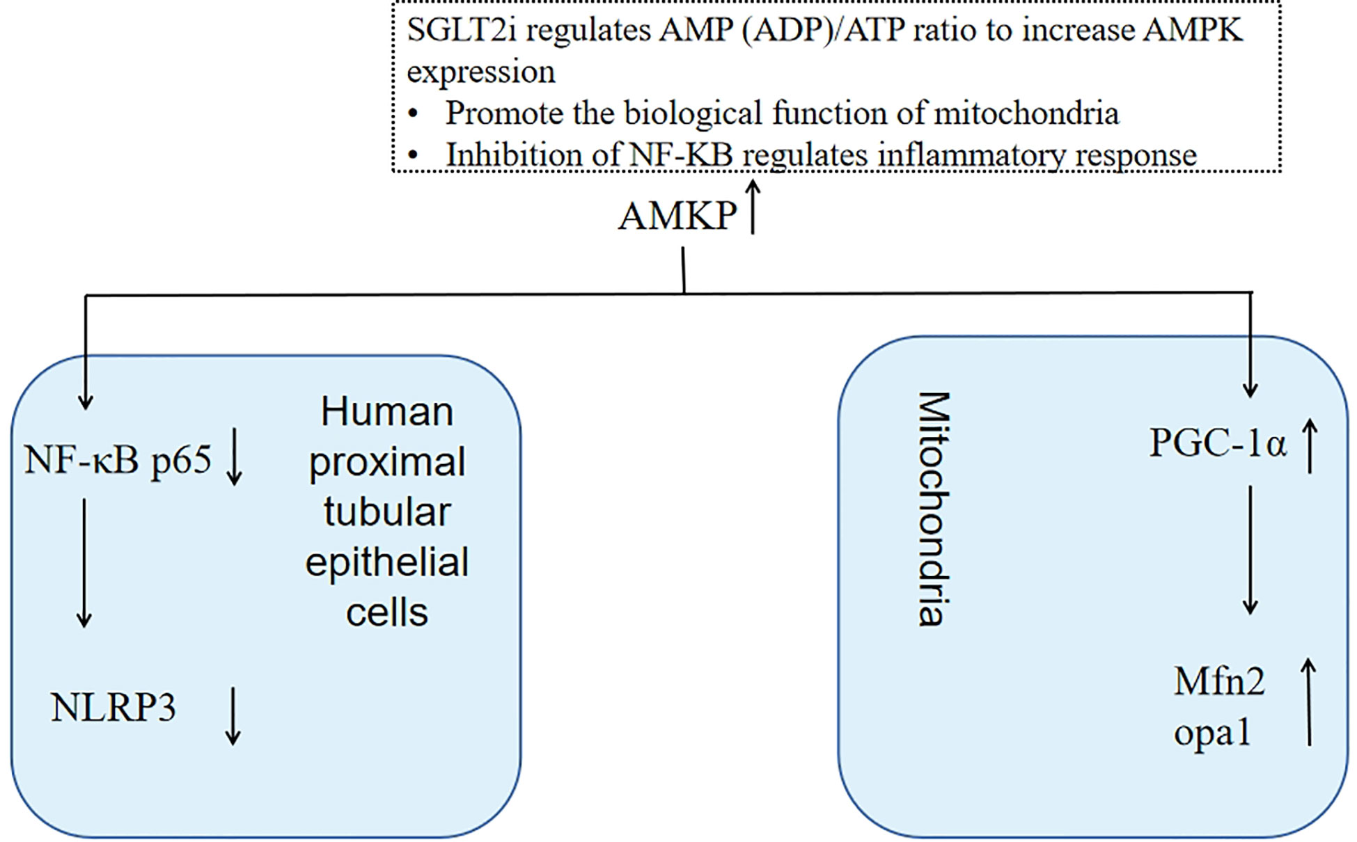 Figure 4 SGLT2i increases AMPK expression by regulating AMP(ADP)/ATP ratio, which can not only regulate mitochondrial function to maintain renal tubular energy metabolism but also inhibit NF-kB to reduce inflammatory reactions.