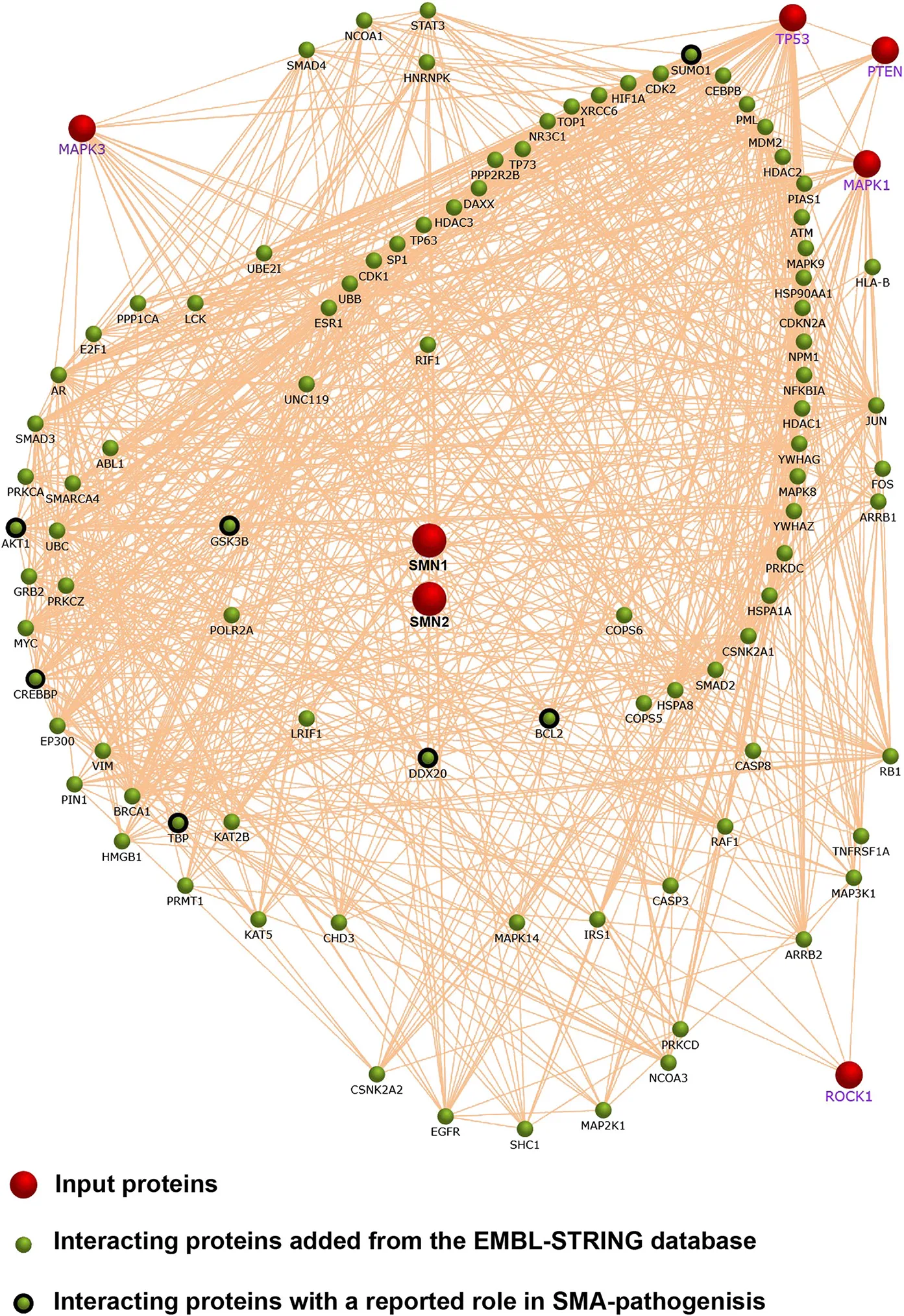 We performed a network analysis based on published reports about altered signaling in SMA. Therefore, we included SMN, JNK3 (MAPK3), p53 (TP53), PTEN, ERK (MAPK1), and ROCK1 as input proteins (red dots). We used the Functional Enrichment Analysis Tool (FunRich) (61) with the EMBL-STRING database for a network analysis (60). Highly connected interactors were added to the network (green dots). Interestingly, a number of them have been connected to SMA pathology before (black outlined green dots). However, the selection of the input proteins may be biased a priori. It is not always clear whether those pathways have been identified in hypothesis-free approaches. An unbiased high-throughput approach may circumvent this drawback.