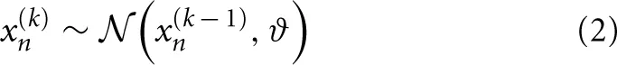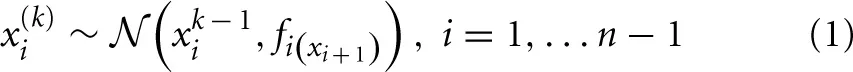 To illustrate its general structure, let us assume that we track a quantity x1 in our environment which evolves as a Gaussian random walk. Let us now characterize the variance of this random walk as a function of a higher level, x2, which is itself a Gaussian random walk. x2 now controls the step size of the random walk performed at the first level via some transformation function f, and thus determines our uncertainty about x1. We can continue this hierarchical coupling up to some n-th level: